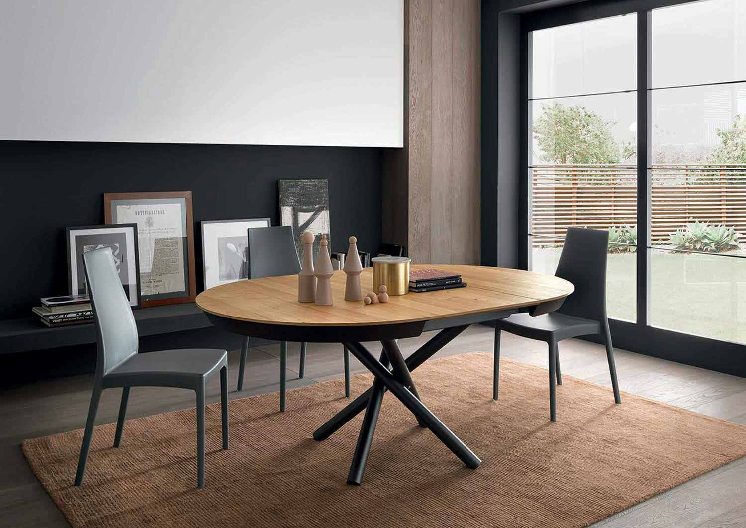 Ronde uitschuifbare eettafel met houten blad en metalen onderstel Made in Italy.