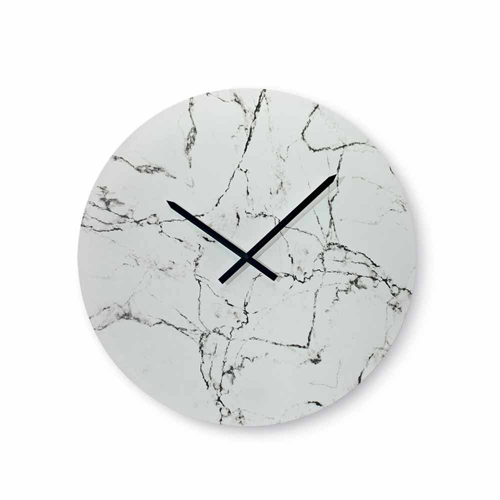 Ronde wandklok Made in Italy van glas met wit marmereffect en zwarte inzetstukken.
