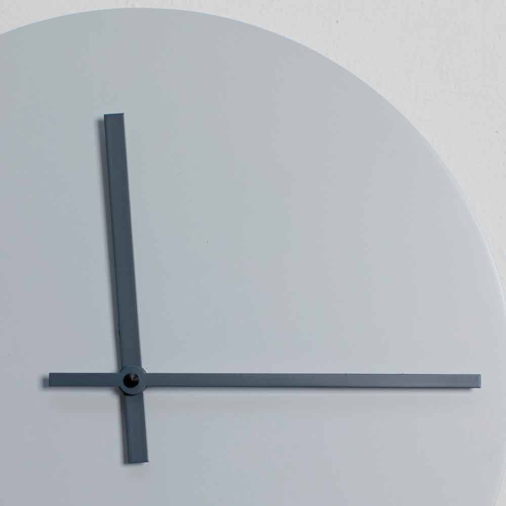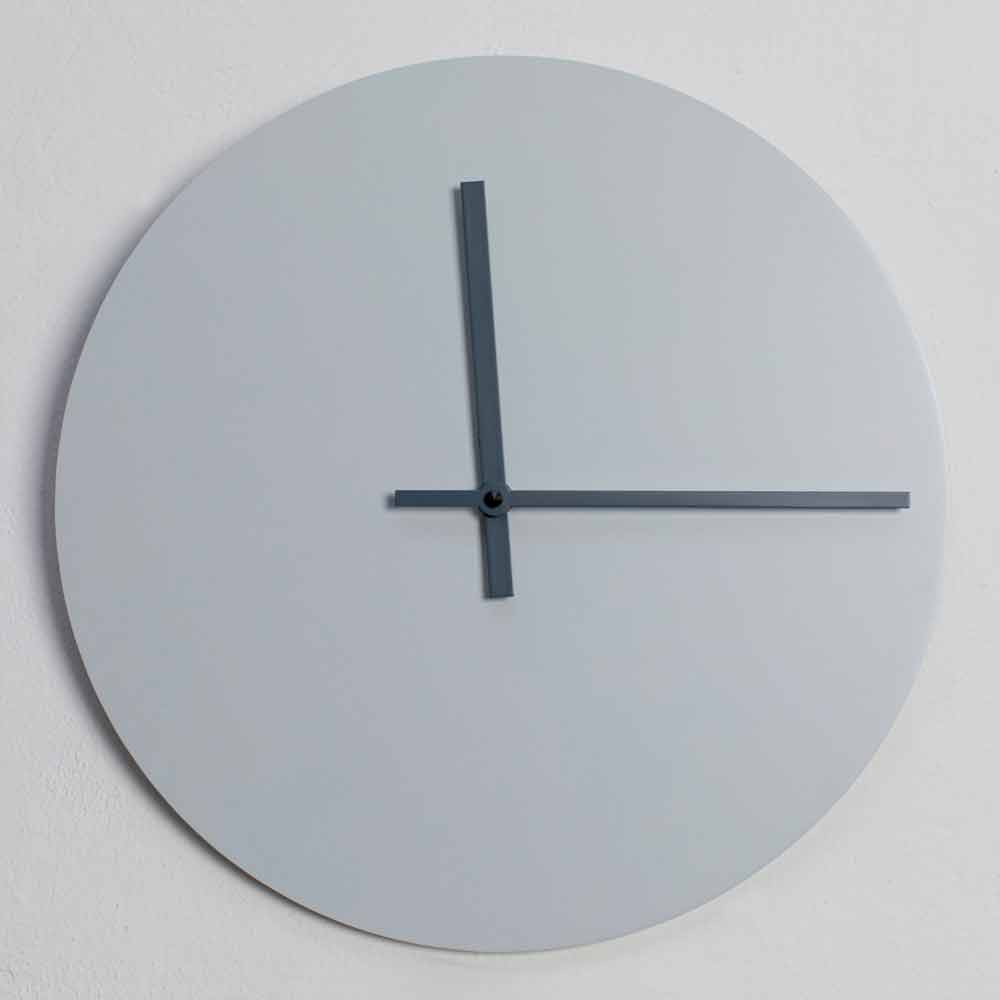 Wandklok in poeder grijs en walvisblauw gelakt hout, modern rond design made in Italy.