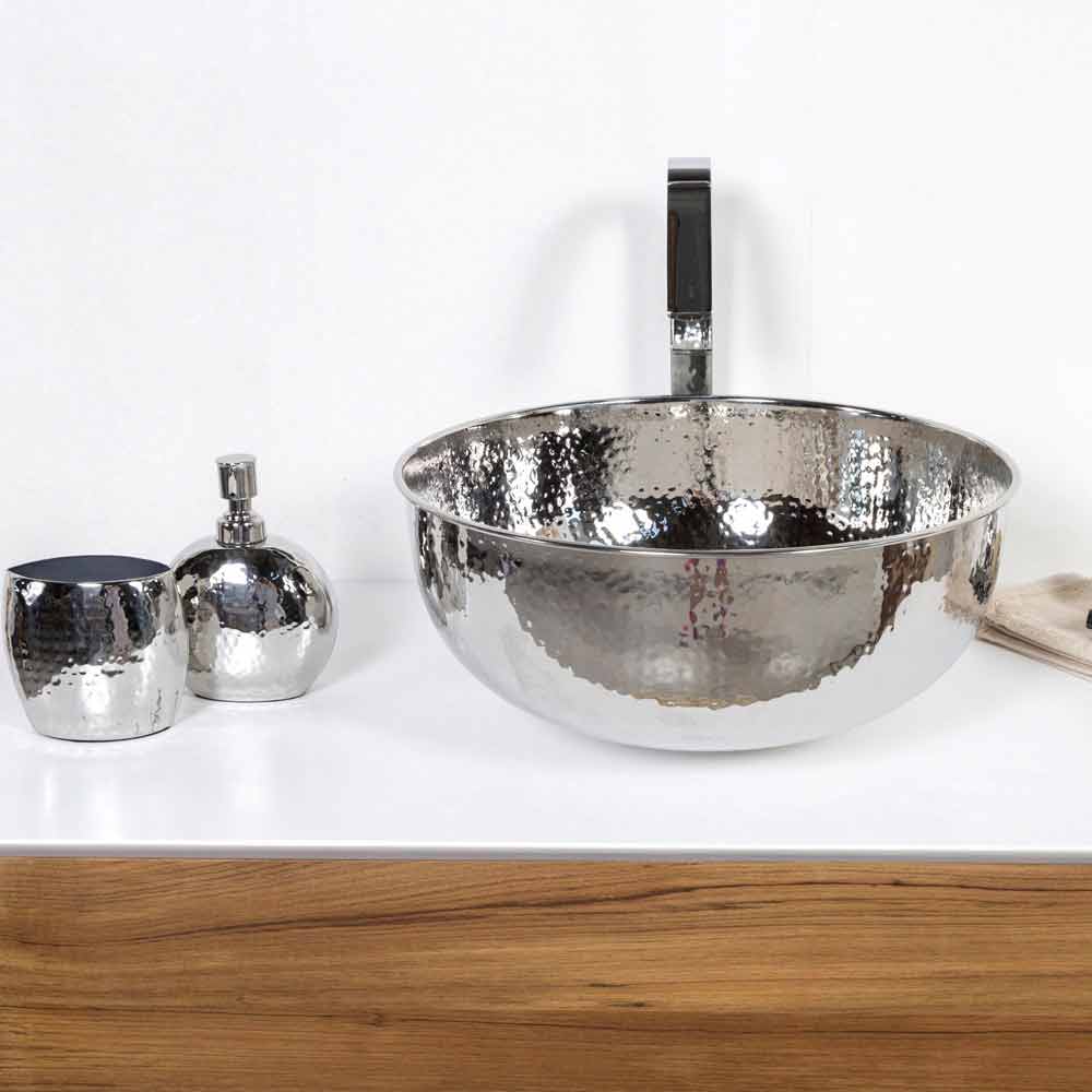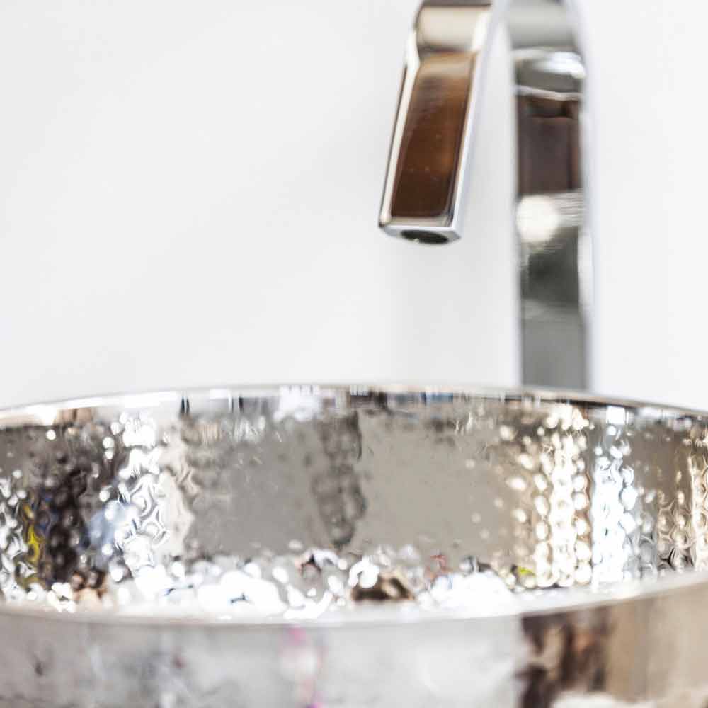 Moderne spoelbak in gehamerd verchroomd messing . De omgekrulde bovenrand geeft de wastafel meer stevigheid en is makkelijk schoon te maken.