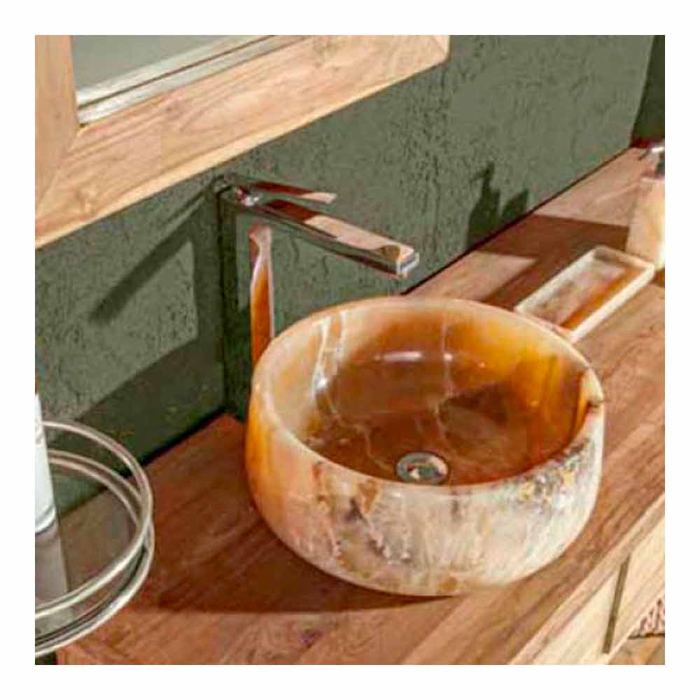 Pure onyx is een zeldzame en kostbare steen. Sensuele en kronkelige vorm die het aanraken ervan verandert in een unieke zintuiglijke ervaring. Uniek en onherhaalbaar, elk stuk is anders. Aanrechtwastafel in puur verzoete en gepolijste onyxsteen. Het gefotografeerde is een voorbeeld dat niet in serie kan worden herhaald.