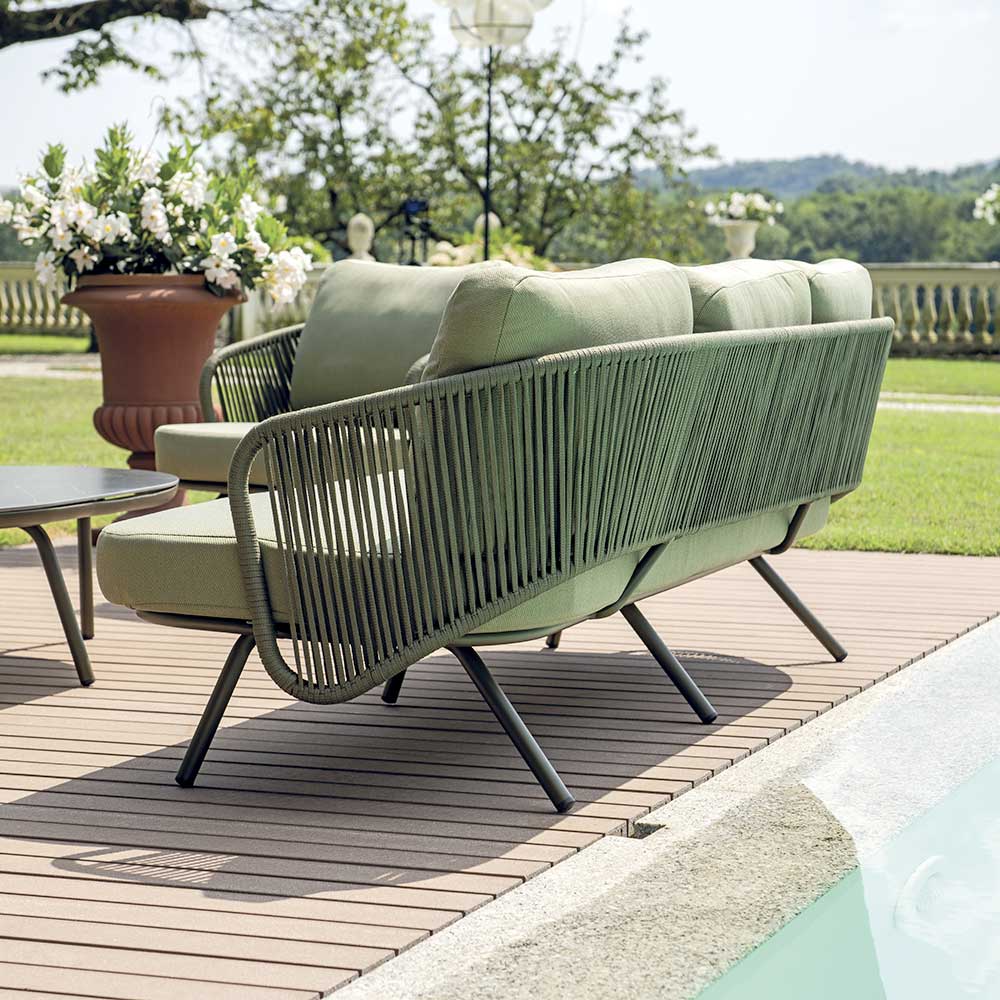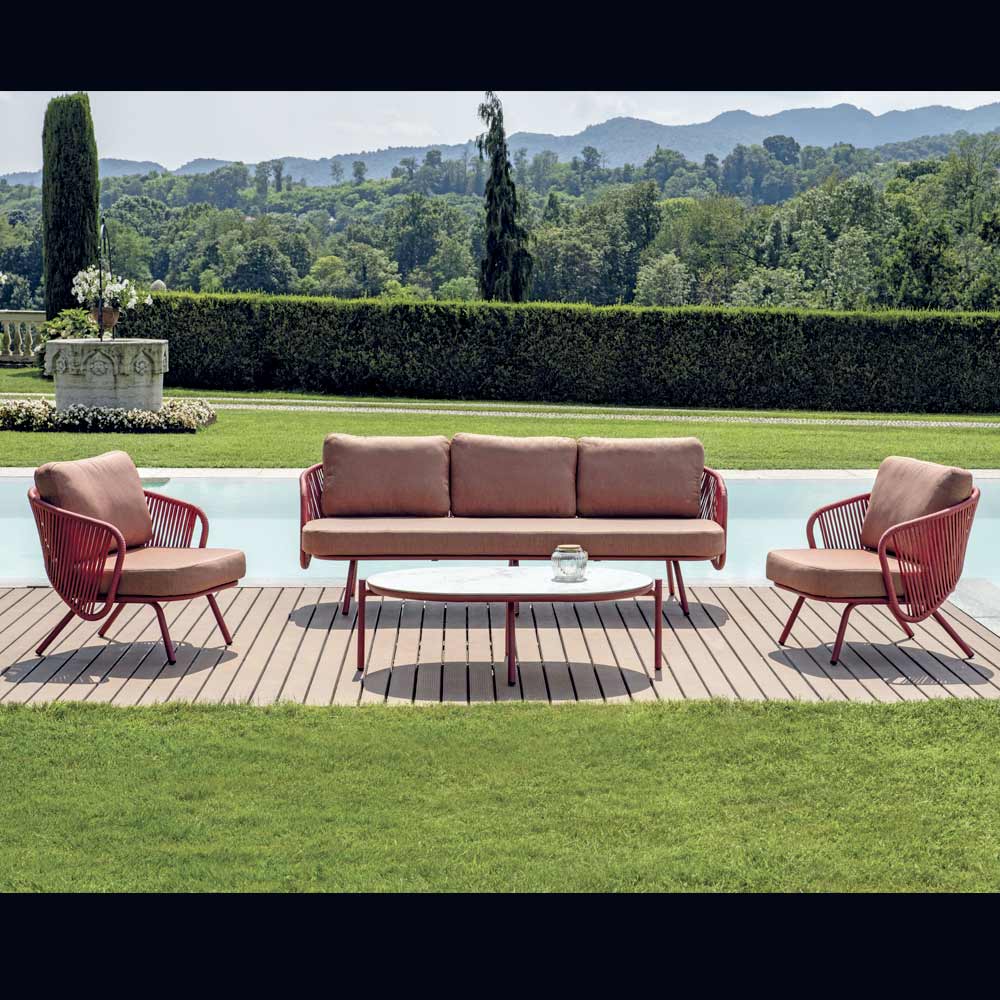 Deze tuinlounge è de ideale oplossing voor wie op zoek is naar een perfecte balans tussen elegantie en comfort. Bestaande uit fauteuils en bank met gestoffeerde kussens en een stevige salontafel, is deze set è de ideale aanvulling om te genieten van ontspannen momenten in de buitenlucht. Het moderne ontwerp en de strakke lijnen passen perfect in elke buitenomgeving, van ruime patio's tot gezellige tuinen.