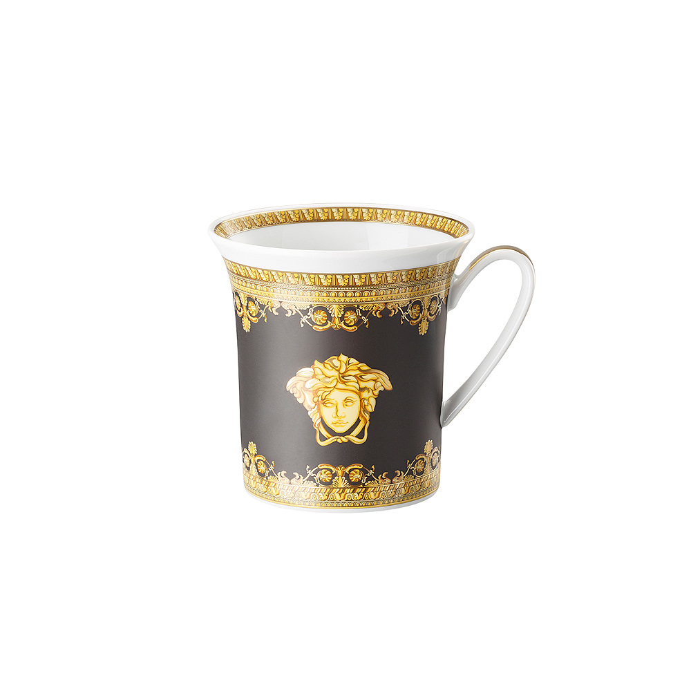 Het I Love Baroque glas van Versace , vervaardigd uit fijn porselein , is een icoon van tijdloze elegantie en luxe . Met een ingewikkeld ontwerp combineert het het iconische gezicht van de Medusa met gouden barokke ornamenten die harmonieus in elkaar overlopen op een zwarte of witte achtergrond, wat een visueel effect van grote impact en verfijning creëert.