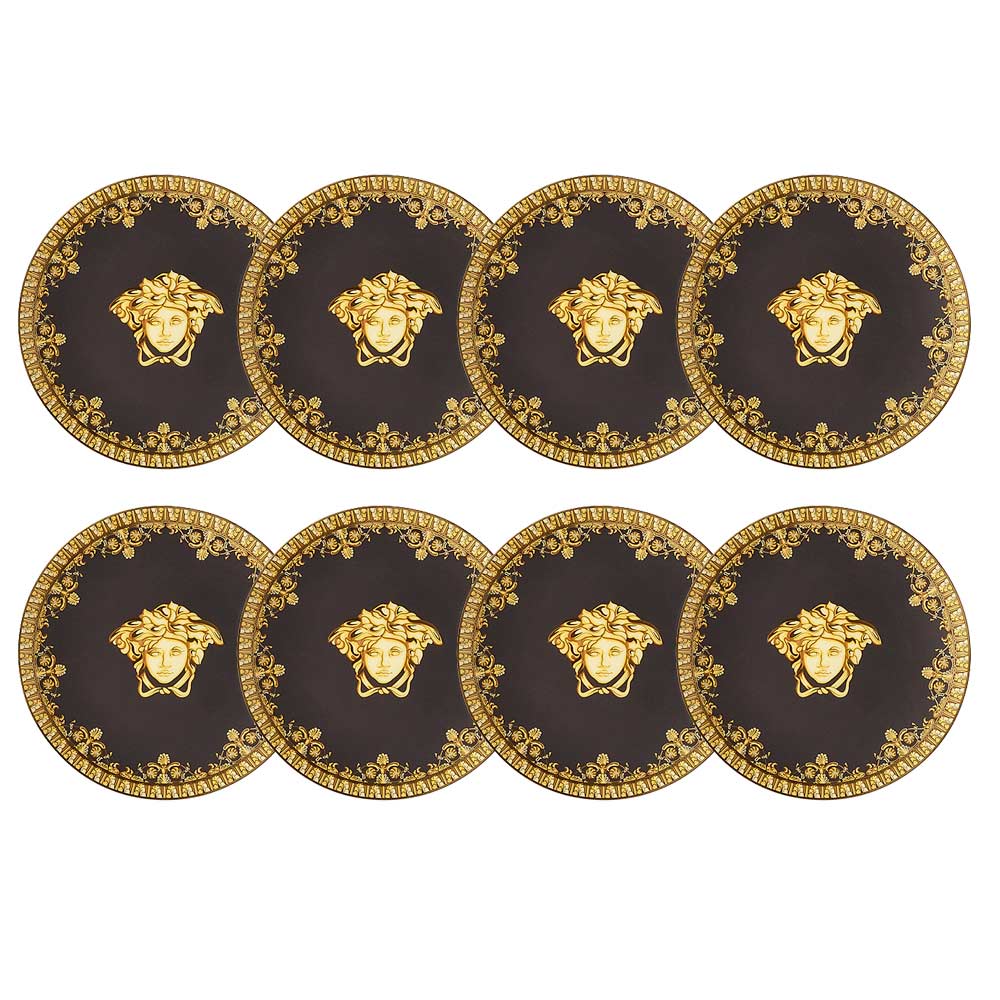 Het I Love Baroque bord van Versace , gemaakt van fijn porselein , is de essentie van verfijning en tijdloze luxe . Het verfijnde ontwerp heeft een diepzwarte achtergrond, verrijkt met een rand versierd met gouden barokke motieven die de artistieke traditie van het huis belichamen. In het midden domineert het iconische gezicht van Medusa , een symbool van macht en eeuwige charme, wat een koninklijk en onderscheidend karakter geeft aan dit meesterwerk.