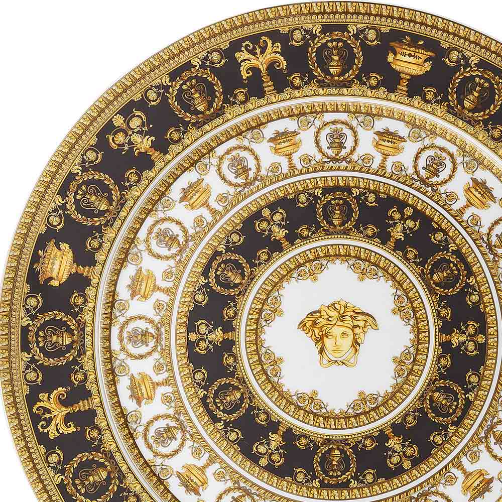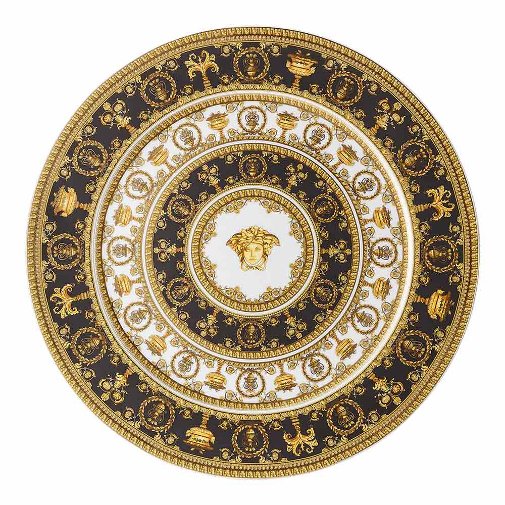De I Love Baroque placemat van Versace , vervaardigd uit kostbaar porselein , is een waar meesterwerk van tijdloze elegantie en verfijning . Het ingewikkelde ontwerp heeft rijke gouden barokke details die harmonieus in elkaar overlopen op een zwart-witte achtergrond, wat een visueel effect van exclusieve luxe creëert. Het iconische gezicht van Medusa , het onmiskenbare symbool van het huis, valt op in het midden, omlijst door sierlijke motieven die de koninklijke uitstraling ervan versterken.