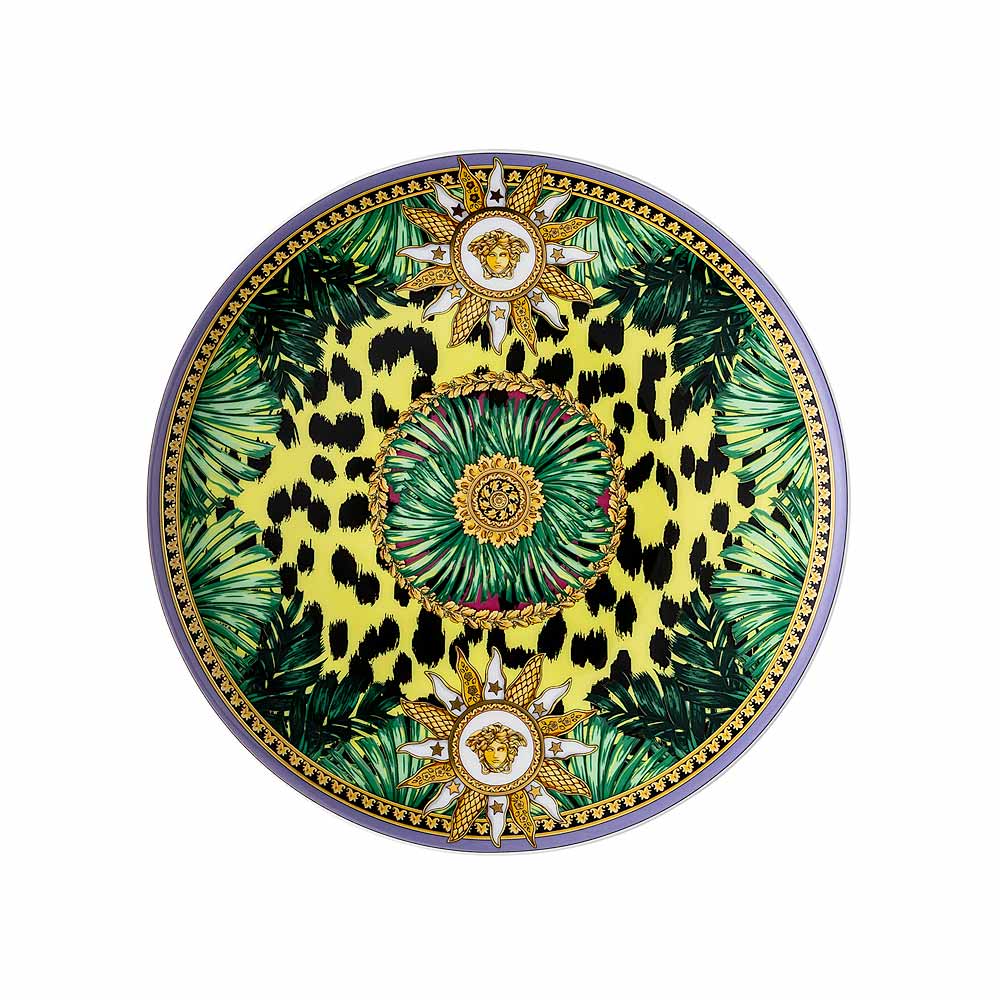 Het Versace Jungle Animalier broodbord , gemaakt van fijn porselein , is een explosie van vitaliteit en exotische luxe . Het gedurfde ontwerp heeft een levendige achtergrond versierd met tropische bladmotieven en animalier details, allemaal versterkt door het iconische Medusa -symbool in een gouden zon, een symbool van energie en kracht.