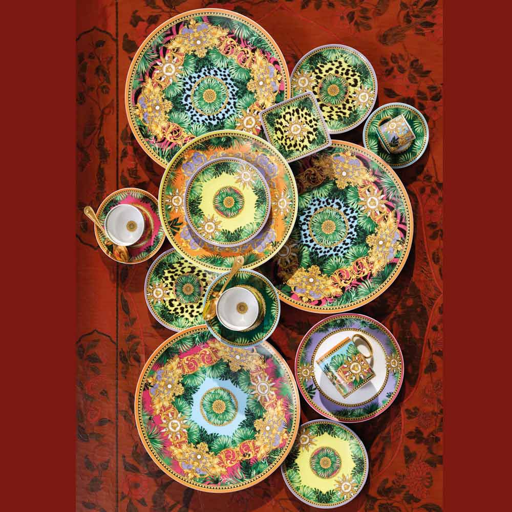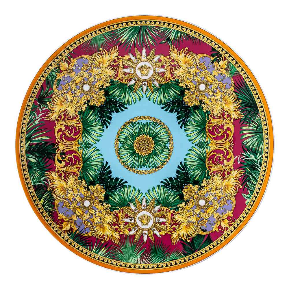De Jungle Animalier placemat van Versace , in fijn porselein , is een viering van exotisme en luxe . Het buitengewone ontwerp combineert een mix van tropische motieven , met weelderige bladeren, gouden barokke elementen en het onmiskenbare symbool van de Medusa , in een stralende zon. De felle kleuren, variërend van donkergroen tot turquoise, met robijnrode details en gouden accenten, creëren een levendig en boeiend kunstwerk.