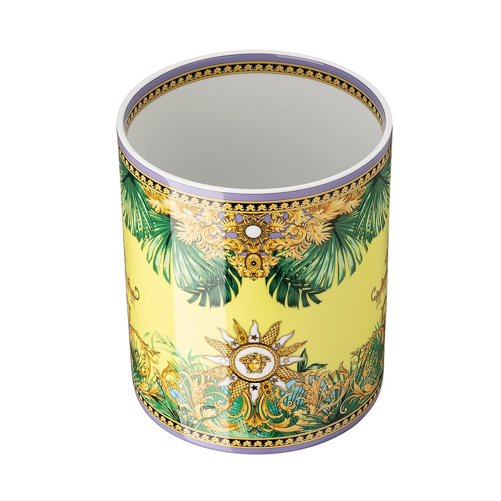 De Jungle Animalier vaas van Versace , gemaakt van fijn porselein , is een meesterwerk dat exotische elegantie en tijdloze luxe combineert. Het verbluffende ontwerp heeft een levendige gele kleur, versierd met tropische motieven van weelderig gebladerte en ingewikkelde barokke details, allemaal omlijst door het legendarische Medusa -symbool in het midden, in een stralende zon en versierd met gouden details.
