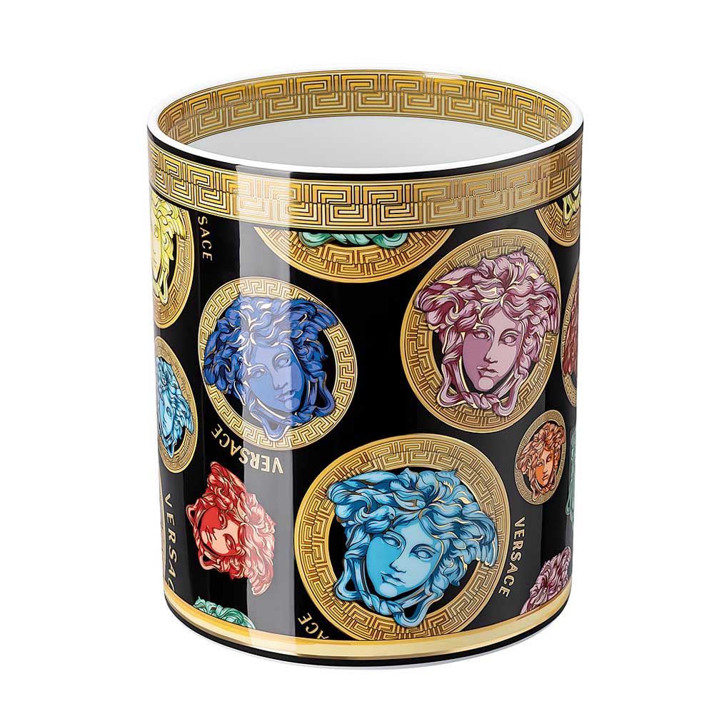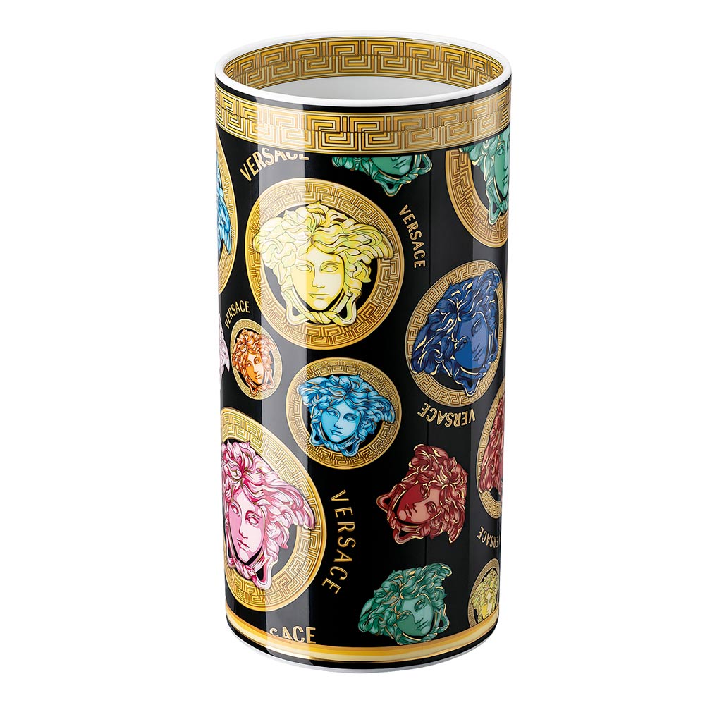 De Medusa Amplified Multicolor vaas van Versace , gemaakt van verfijnd porselein , is een waar designjuweel. Het betoverende motief benadrukt de iconische Medusa , opnieuw geïnterpreteerd in een levendige verscheidenheid aan kleuren die elegant afsteken tegen de glanzende zwarte achtergrond. Het bovenste frame versierd met het klassieke gouden Griekse motief voegt een vleugje verfijning en weelde toe, waardoor deze vaas een waar kunstwerk is.