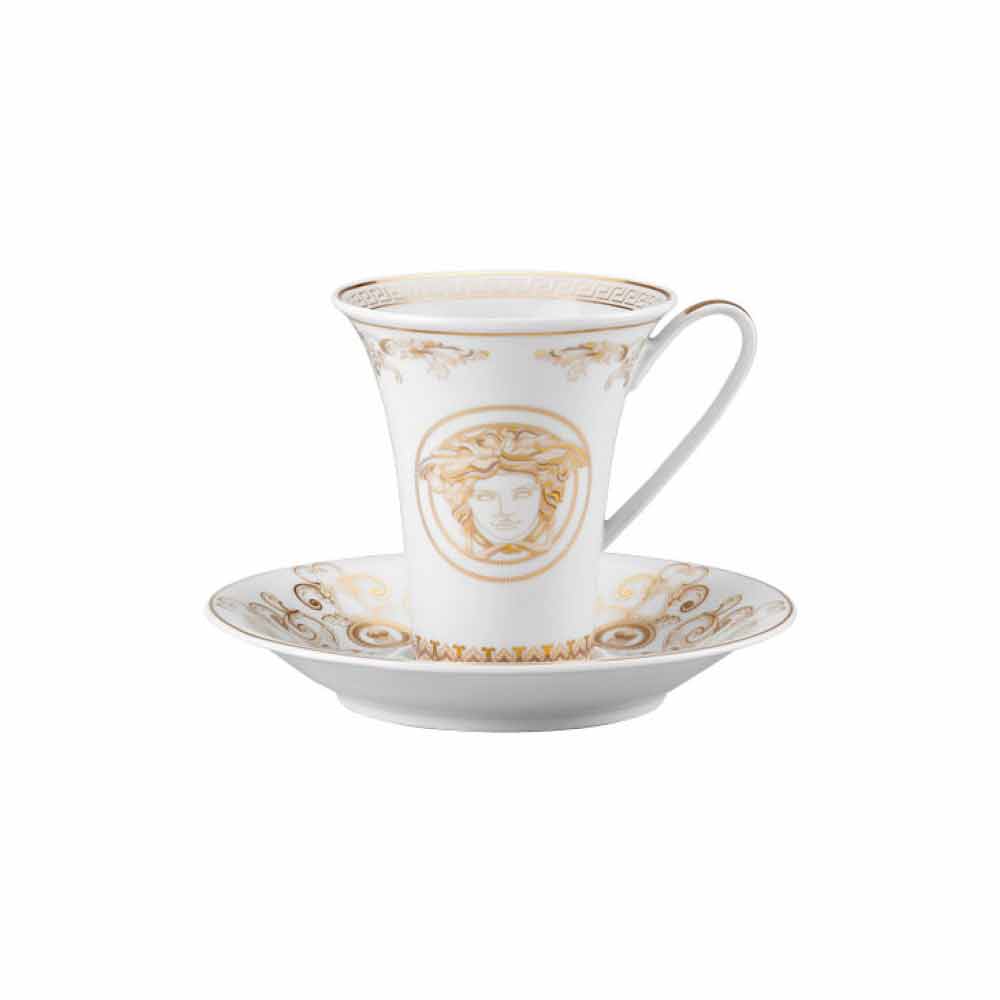 De fantastische en design hoge koffiekop inclusief schotel van Versace maakt deel uit van de verfijnde en luxe Medusa Gala tafelcollectie.