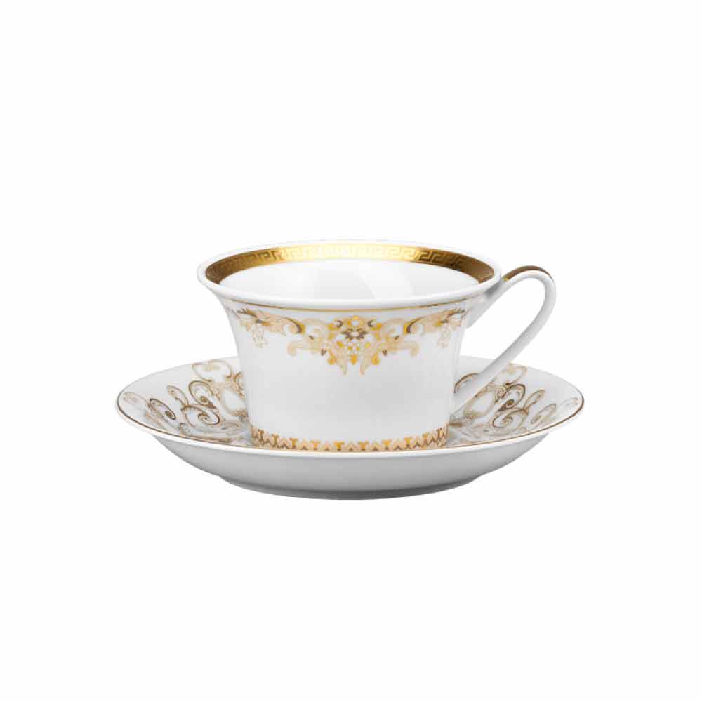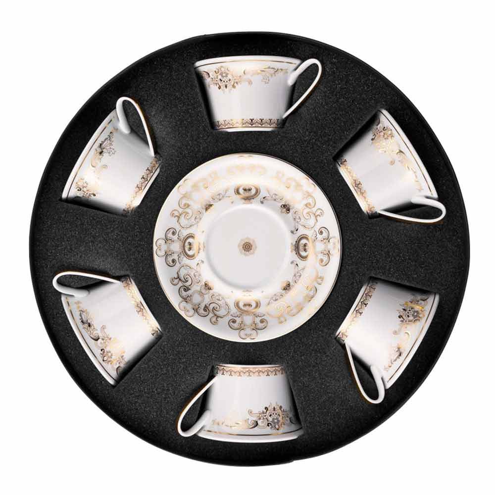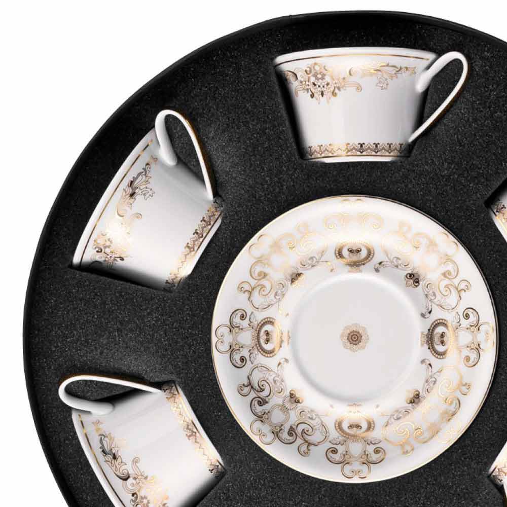 In deze set van 6 theekopjes alle verfijning en luxe van de nieuwe Medusa Gala serviescollectie is ingesloten, die de traditionele Versace- motieven in zijn ontwerp en decoratie opnieuw interpreteert: het icoon met Medusa-afbeelding wisselt af met verfijnde barokke ornamenten in een kostbaar gouden filigraan. Een spannend effect van contrasten tussen de witheid van porselein en puur goud creëert een perfecte mise en place, modern en tegelijkertijd uniek.