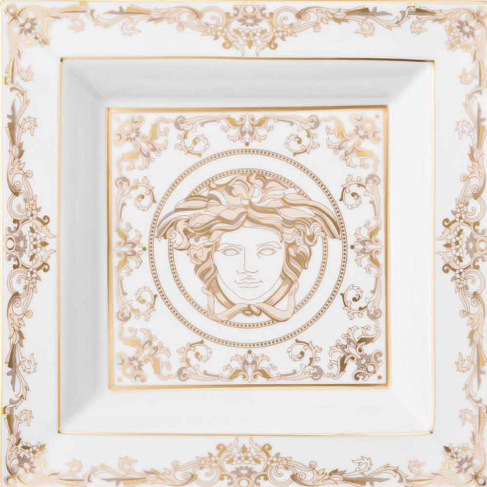 Het hoogtepunt van deze collectie is een prachtig gouden Medusa-hoofd, het onmiskenbare handelsmerk van Versace, omgeven door expressieve barokke decoraties. Het Medusa-hoofd is aanwezig - in het midden - op alle kopjes en kannen, evenals op alle grote en kleine borden van de "Medusa"-collectie. Echte aristocratische kleuren - felrood, elegant goud en zwart - en uitgebreide filigraanpatronen en ornamenten geven het Medusa-hoofd een weelderig kleurenframe van ongekende elegantie. De "Medusa"-collectie omvat een compleet servies en een koffieservies, evenals talrijke accessoires. Grote ontbijtkopjes voor cappuccino en latte, soepborden en kommen maken deel uit van de collectie, net als waardevolle en zeer persoonlijke geschenkaccessoires zoals de servetring, de kaarsenhouder, vazen en een elegant rookset. De twee glascollecties " Medusa Lumière" en "Méandre" en de bestekcollectie "Medusa Gold" maken de elegante, kleurrijke tafel compleet in de unieke stijl van de Versace-wereld.