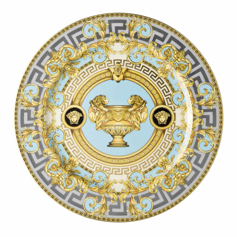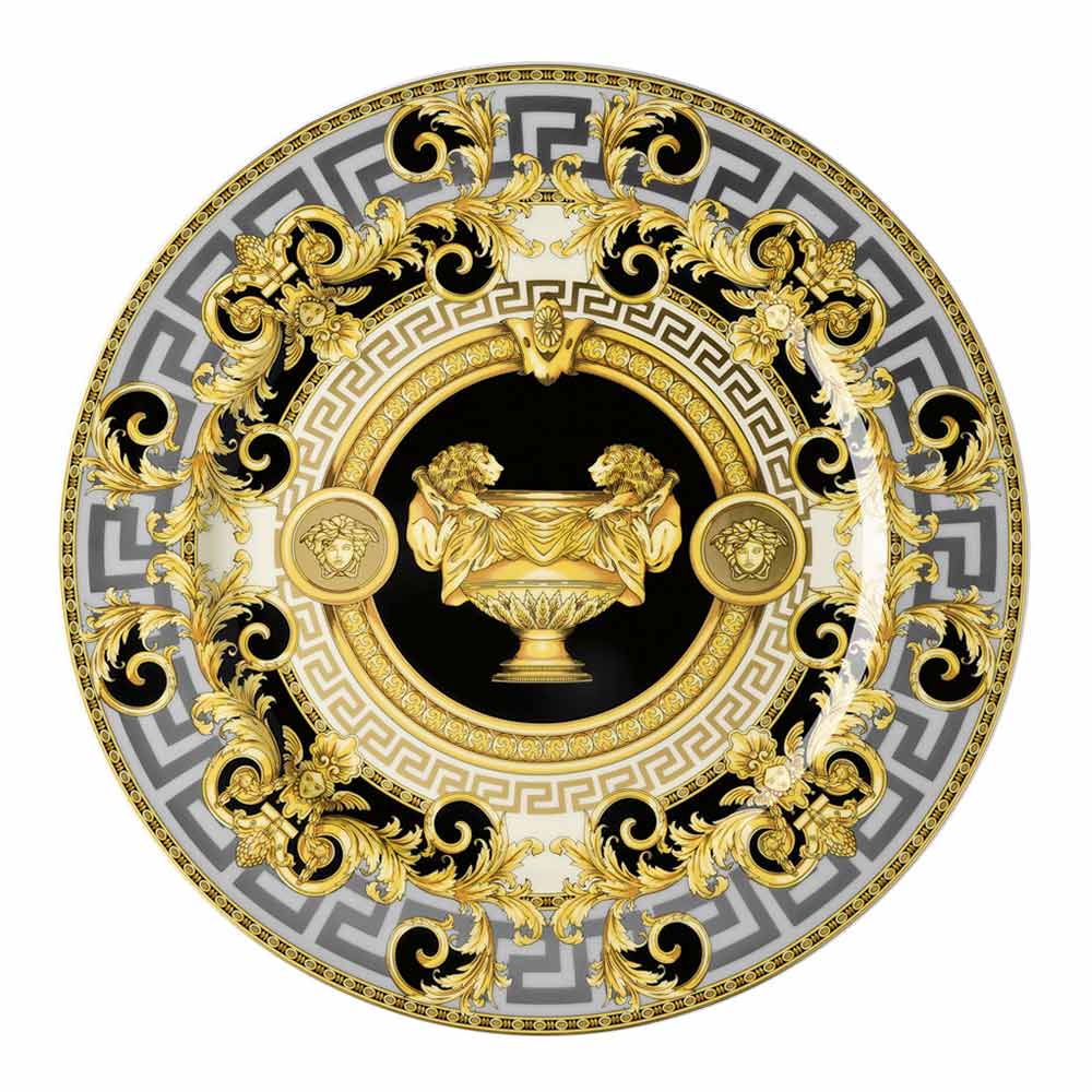 Het Prestige Gala-plaatskaartbord van Versace , gemaakt van verfijnd porselein , is een authentiek eerbetoon aan klassieke elegantie en tijdloze luxe. Het buitengewone ontwerp wordt gedomineerd door een prachtige gouden amfora , een symbool van royalty en majesteit, in het midden van een frame versierd met het klassieke Griekse motief en barokke bloemendetails in goud. Verkrijgbaar in twee achtergrondvariaties, zwart en lichtblauw, biedt dit bord een verfijnd contrast dat elke mise en place verheft.