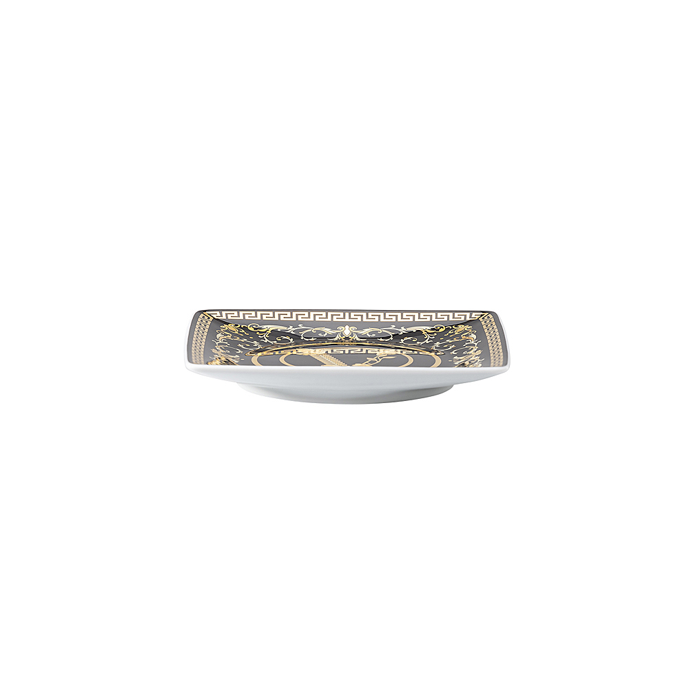 De Virtus Gala flat square cups van Versace zijn de perfecte combinatie van verfijnd design en functionaliteit. Gemaakt van fijn porselein , vallen ze op door hun elegante glanzende achtergrond versierd met barokke gouden details, waaronder het iconische Versace "V"-symbool, een embleem van tijdloze stijl en luxe .