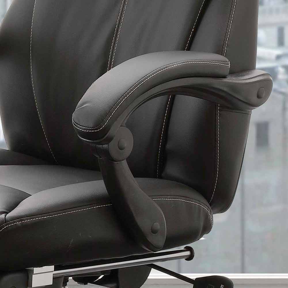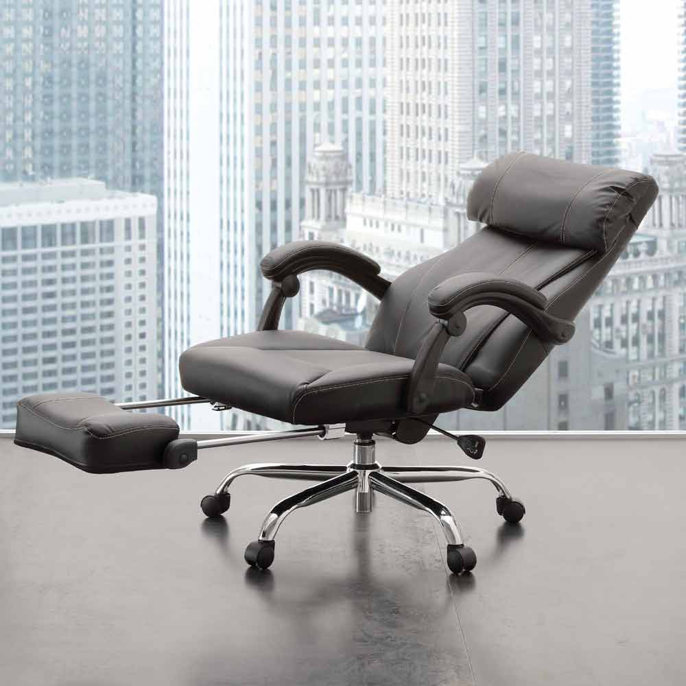 De kantoorfauteuil Nazzareno vertegenwoordigt het beste al deze kwaliteiten; het wordt geleverd met een draaibare stoel met gaslift, rugleuning met kussen bekleed met zwart kunstleer, stoelen en voetsteun in zwart kunstleer; verchroomd metalen frame met wielen.