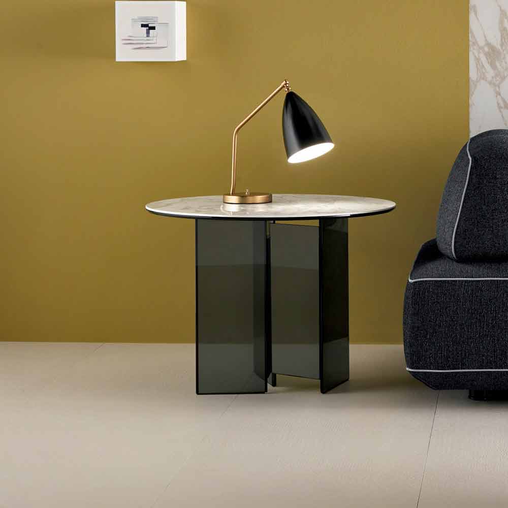 Gemaakt van gerookt glas voor de basis en een gepolijste arabesque calacatta keramische top , het is een meubel handgemaakt in Italië met hoogwaardige materialen, ideaal voor de woonkamer.
