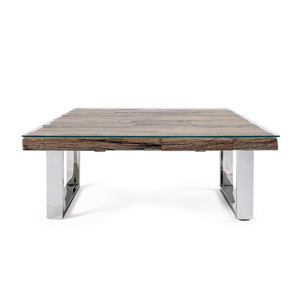 Deze salontafel is gemaakt met een blad van gerecycled hout met een natuurlijke afwerking en gehard glas met roestvrijstalen poten om te monteren.