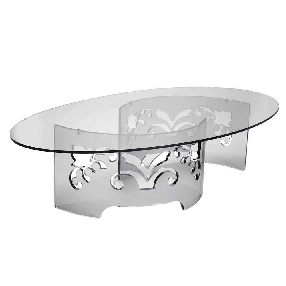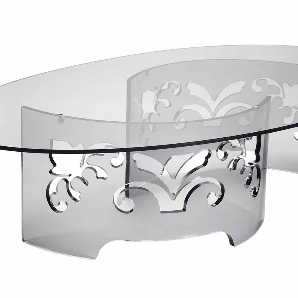 Ovale salontafel in transparant of gerookt plexiglas met laser gesneden gedecoreerde voet gemaakt in Italië.