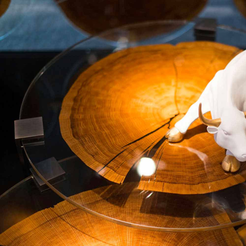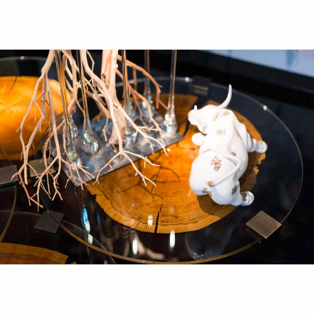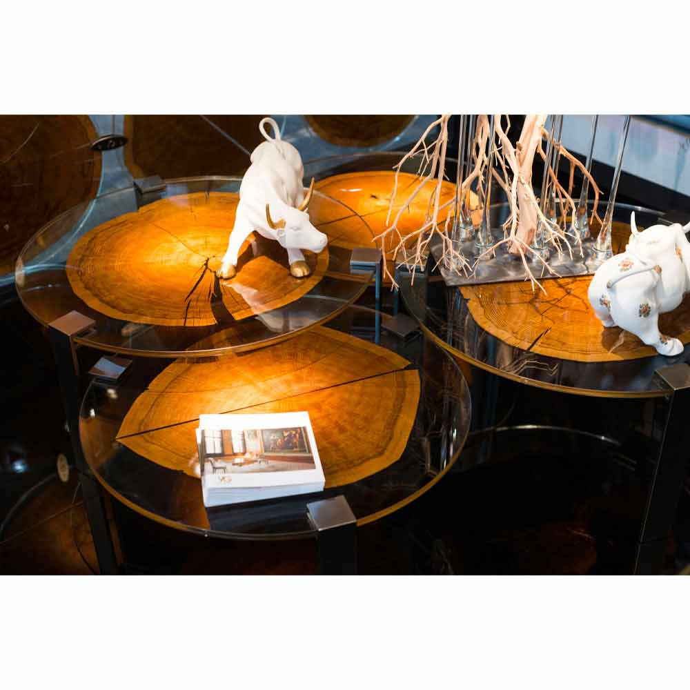 Salontafel gemaakt in Italiëmet rond blad in gekoppeld glas (5 + 5 mm) waarbinnen een dun deel van gezaagd hout is geplaatst, ondersteund door 3 metalen poten met gepolijste messing afwerking . Uit de exclusieve combinatie van de verfijnde aanraking van glas, de prachtige kleuren van hout en de moderne esthetiek van metaal, is een unieke inrichtingsoplossing geboren die zijn idee baseert op concepten van innovatie en elegantie voor een avant-gardistisch resultaat met een sterke persoonlijkheid. eigentijds . De kracht wordt vertegenwoordigd door de perfecte combinatie van afwerkingen en materialen die de waarde van de salontafel verhogen zonder ooit het fundamentele functionele aspect te verwaarlozen dat wordt benadrukt door de 100% Made in Italy vakmanschap en het gebruik van hoogwaardige grondstoffen, waardoor een meubelaccessoire kan worden aangeboden met een revolutionaire schoonheid en tegelijkertijd bijzonder solide en resistent .
