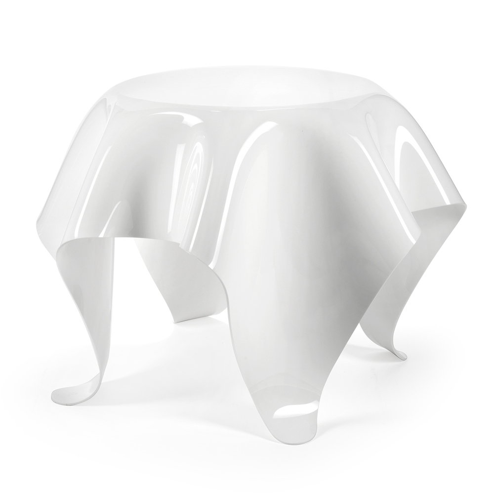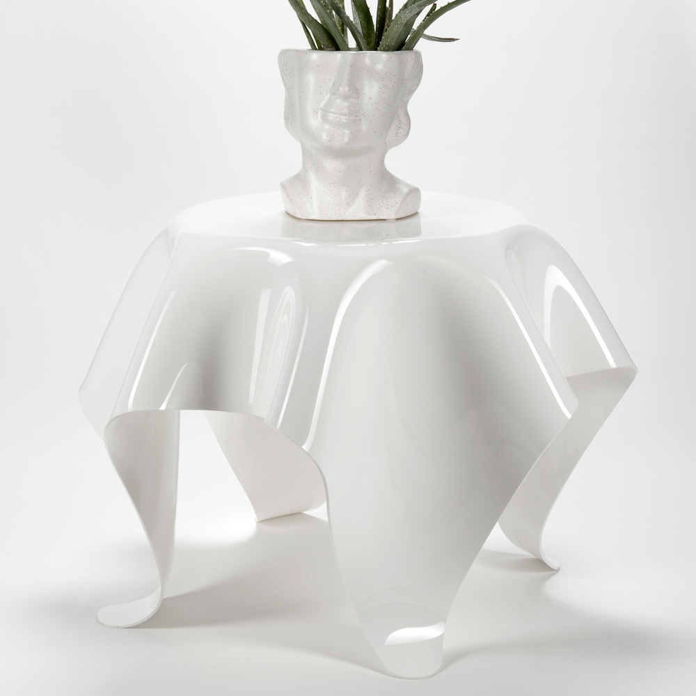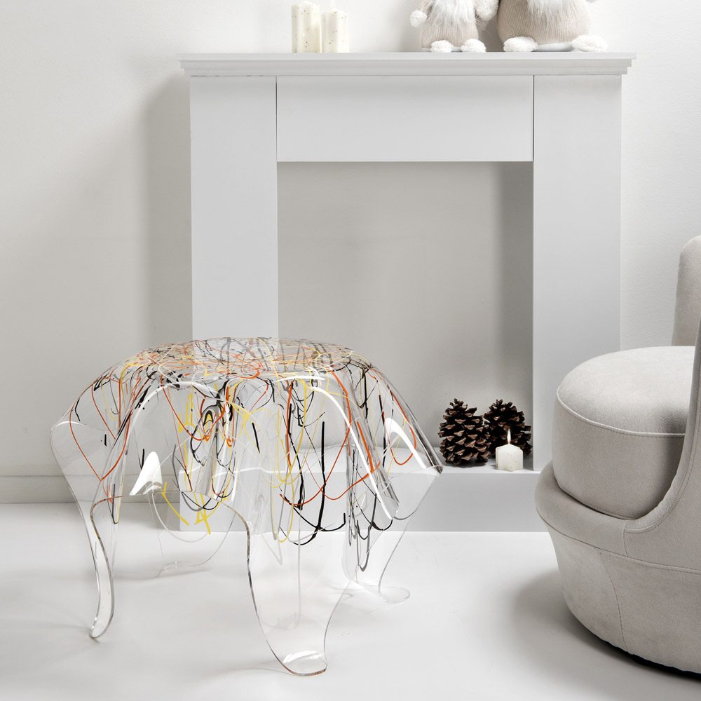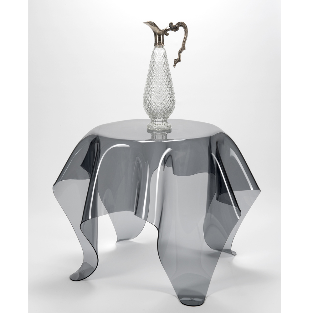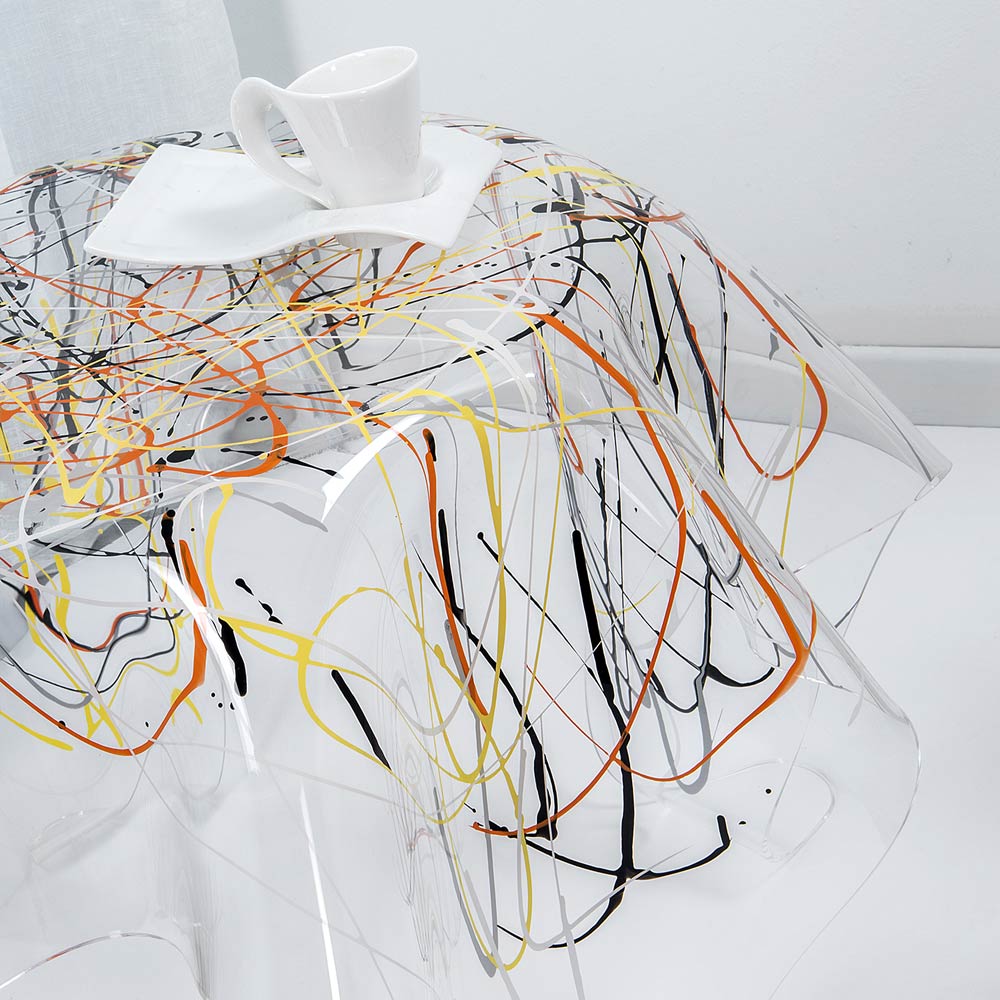 Salontafel in plexiglas met handgemaakte gordijnen Made in Italy.