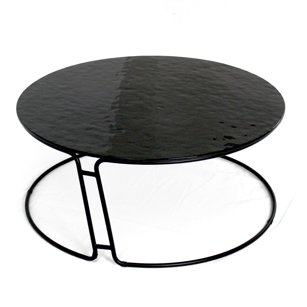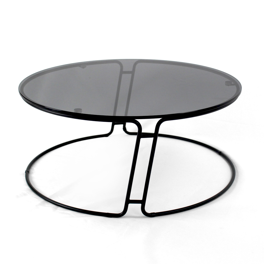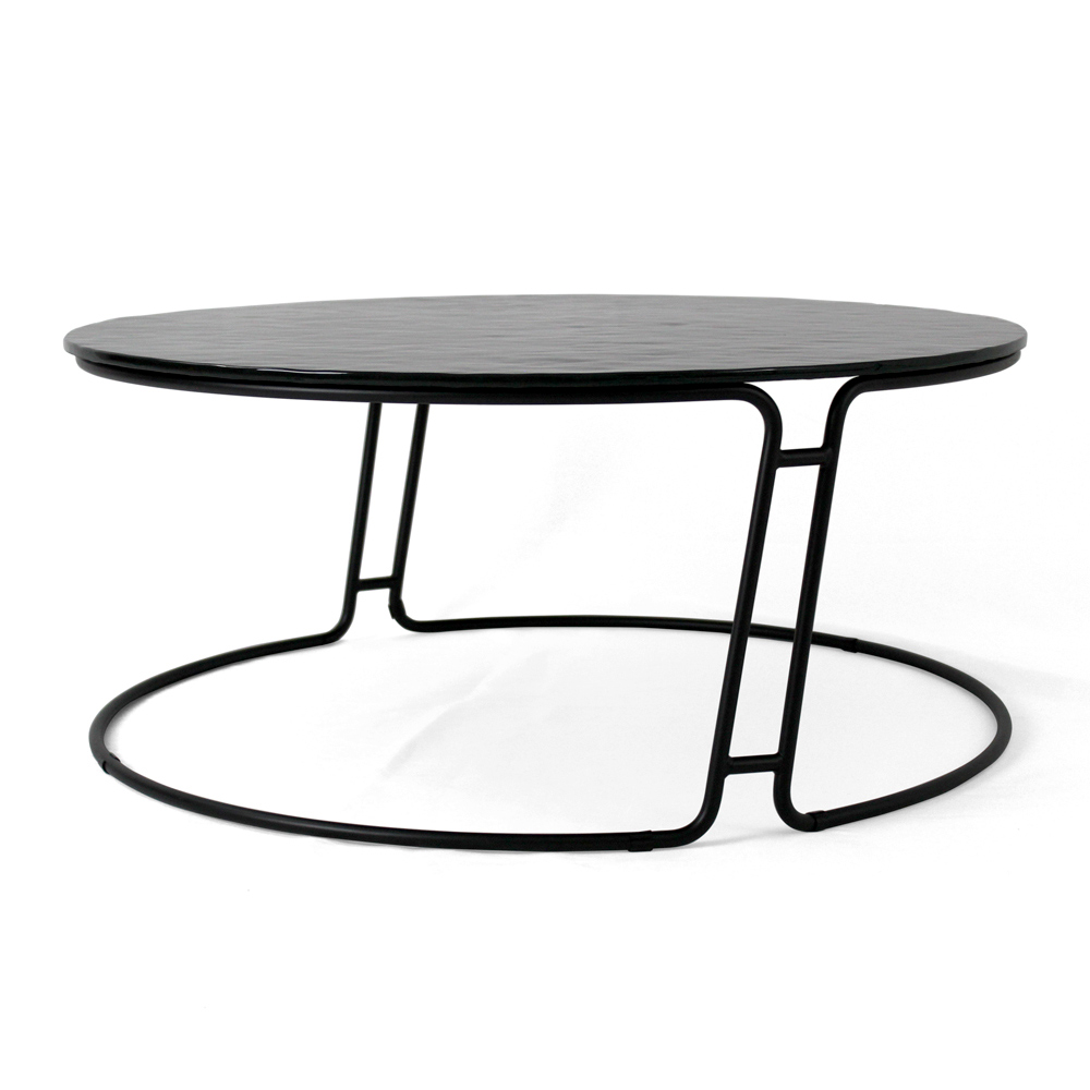 Ronde salontafel met gelakt stalen onderstel en glazen blad.