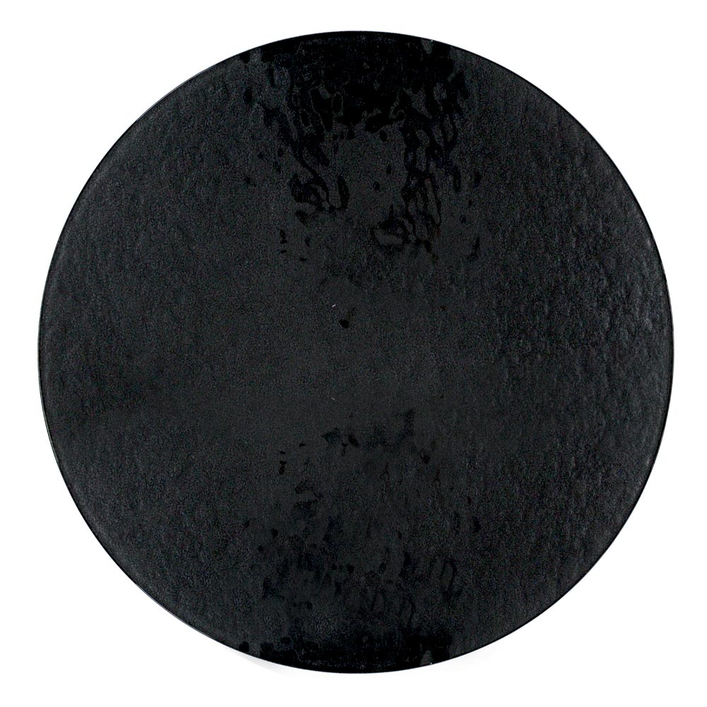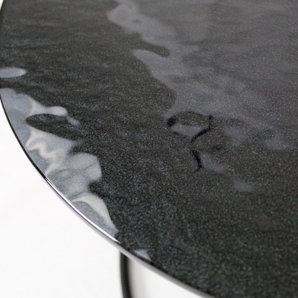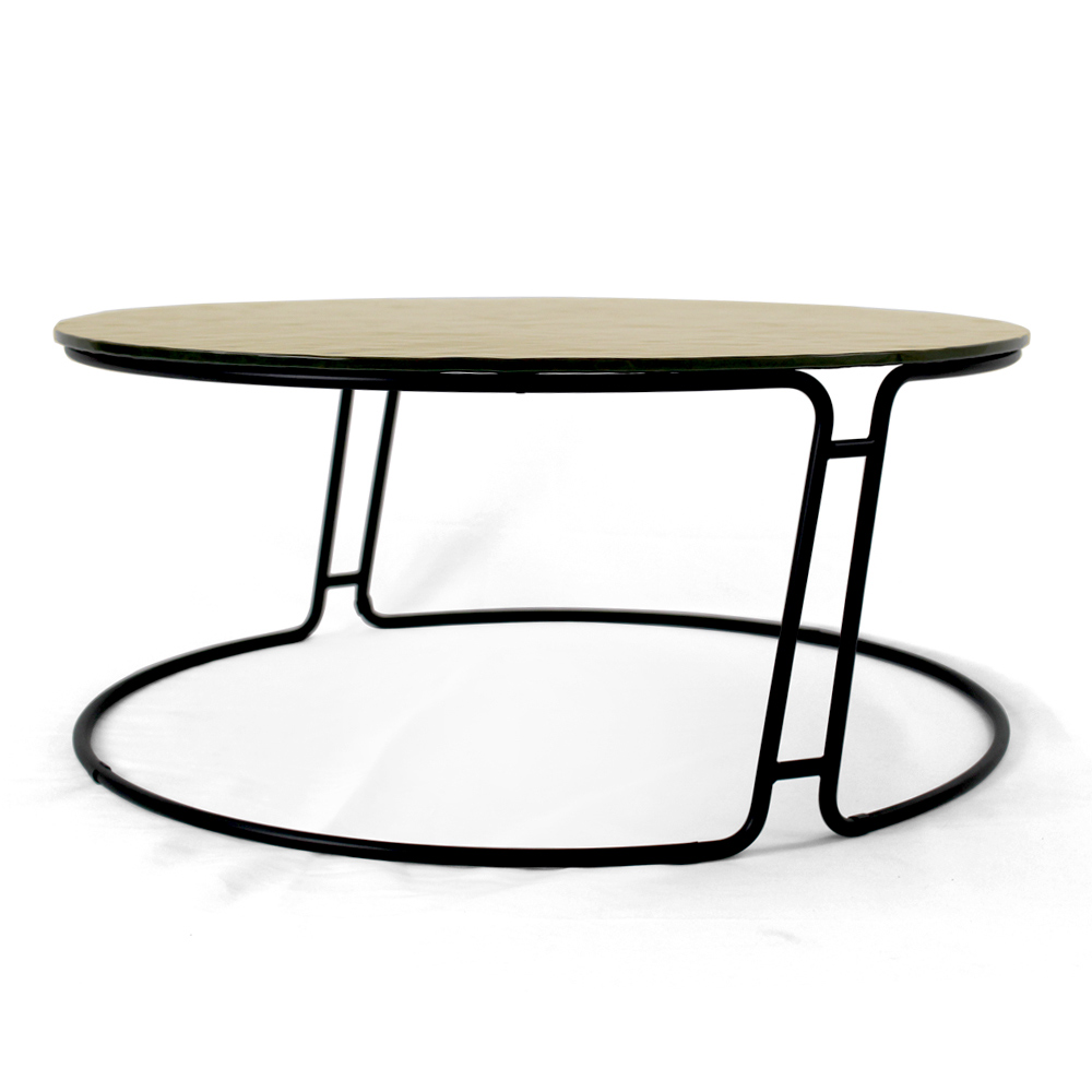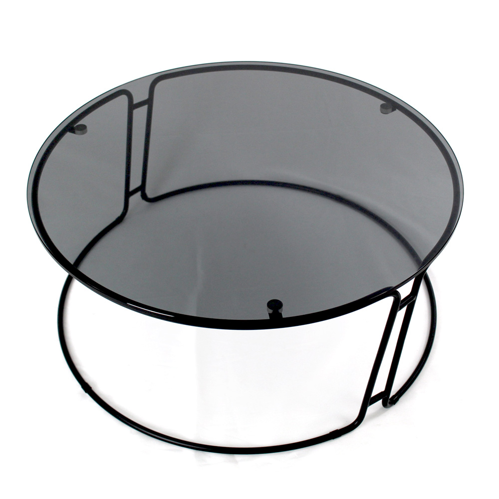 Ronde salontafel met gelakt stalen onderstel en glazen blad.