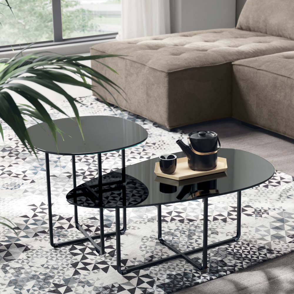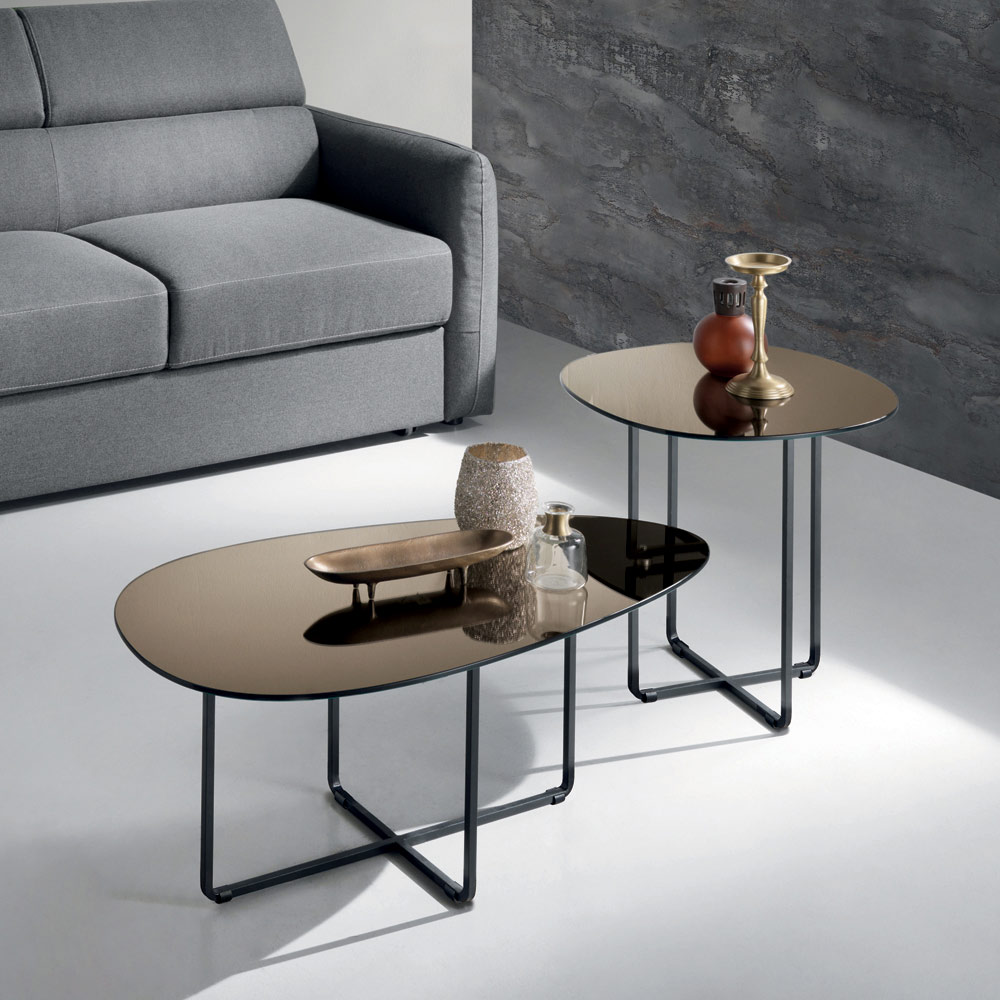 Het tafelblad is verkrijgbaar in spiegelglas , wat de ruimte extra licht geeft, of in keramiek met marmerlook, gelaagd op glas . Deze laatste optie combineert duurzaamheid met een verfijnde uitstraling. Dankzij deze dubbele keuze kunt u de tafel aanpassen aan de stijl van de kamer.