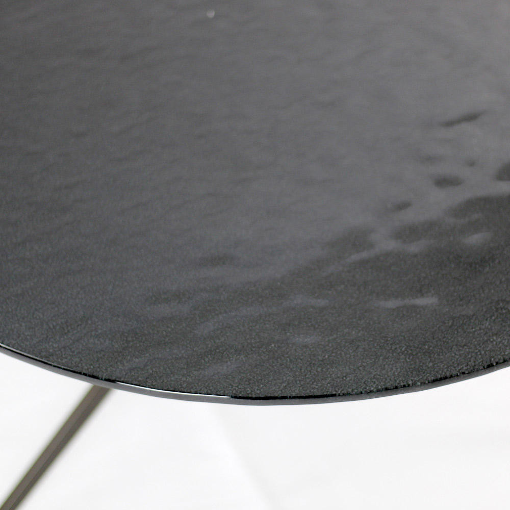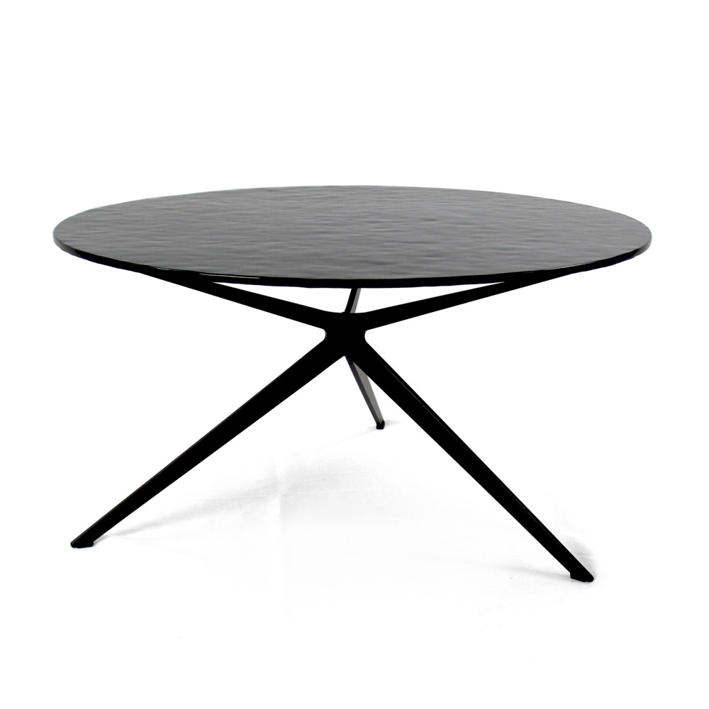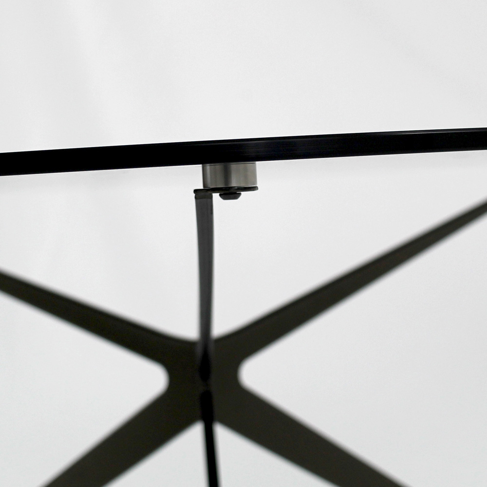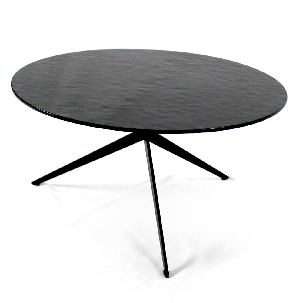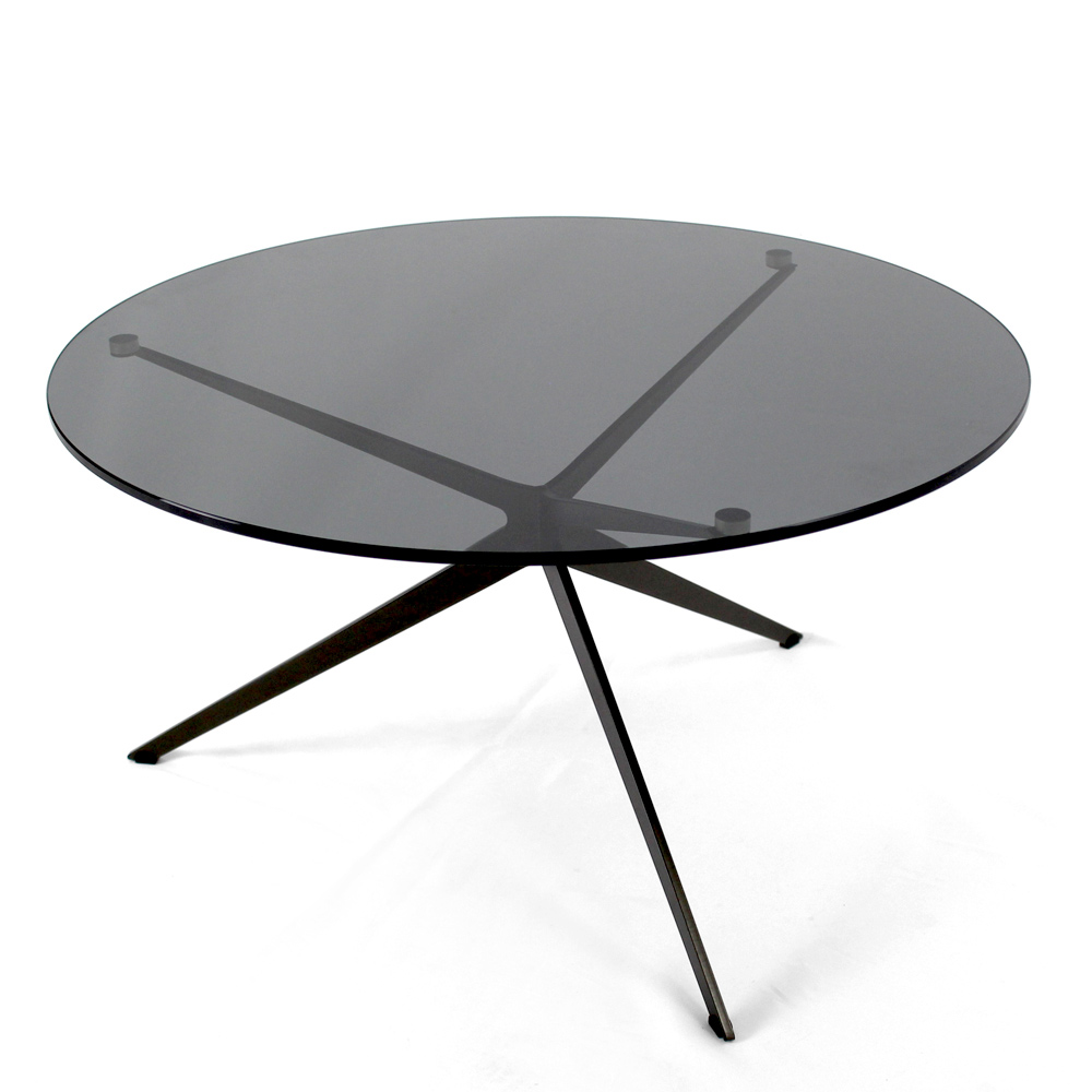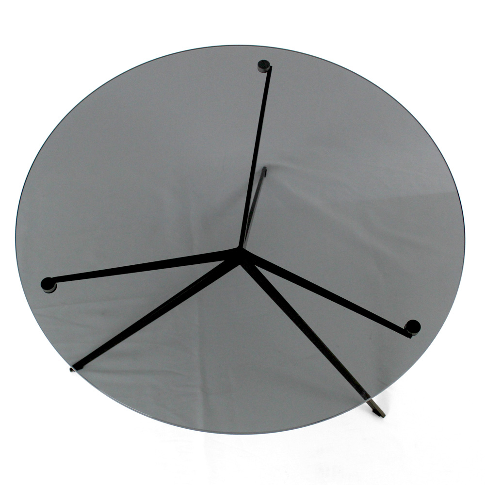 Ronde salontafel met gelakt stalen onderstel en glazen blad.