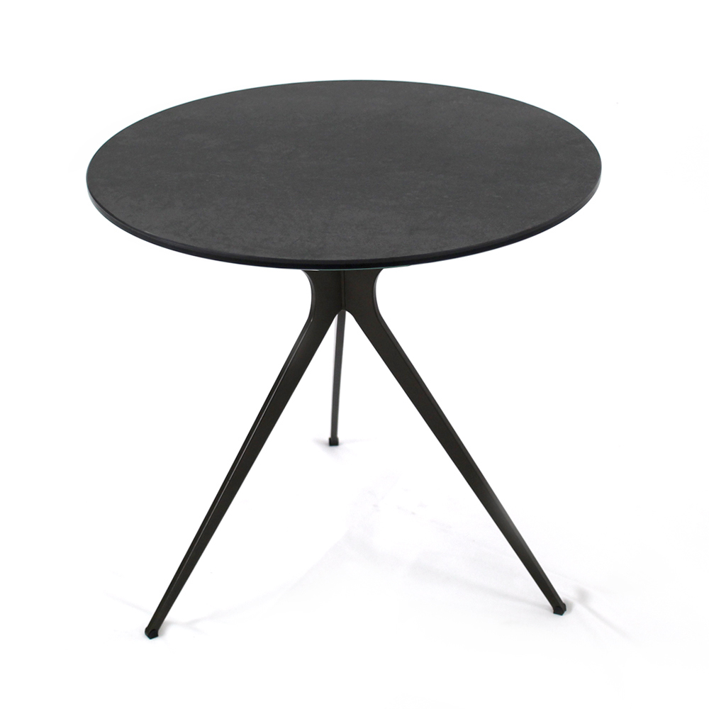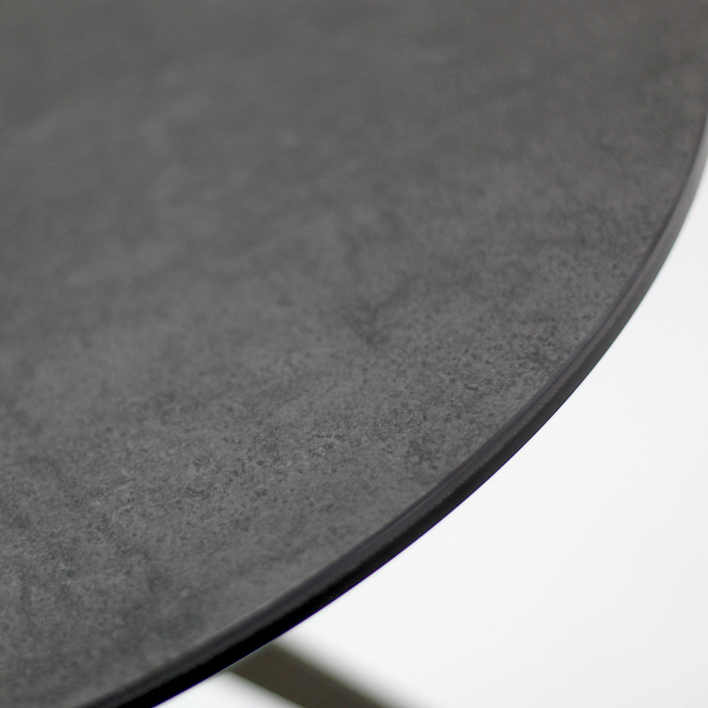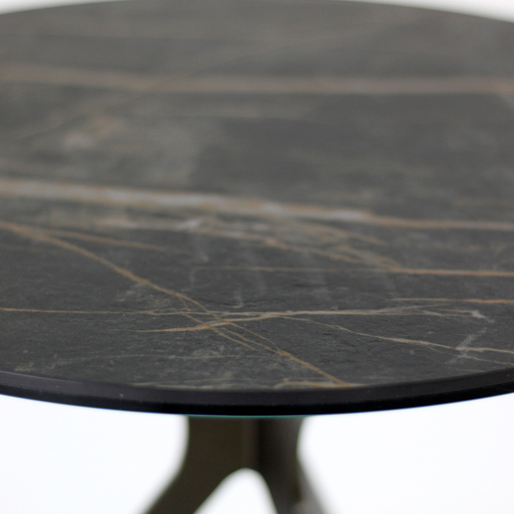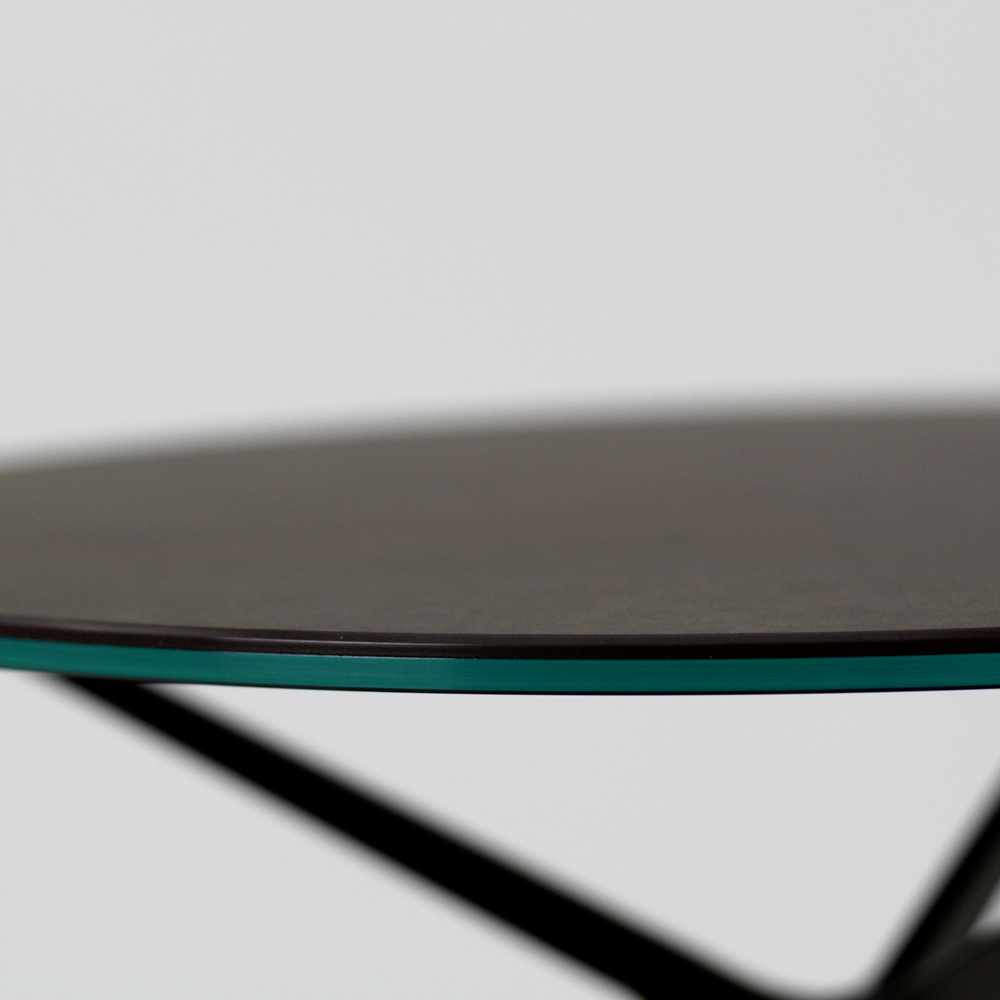 Ronde salontafel met gelakt stalen onderstel en porselein steengoed top.
