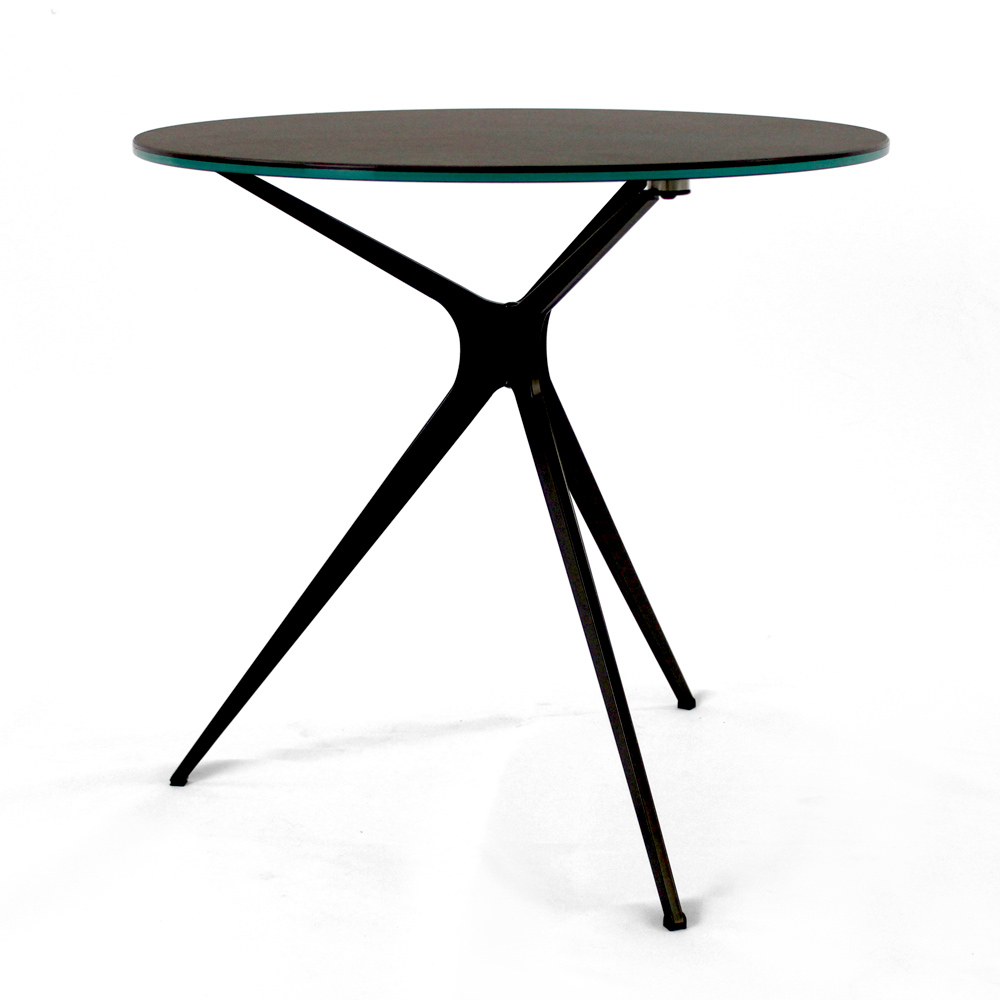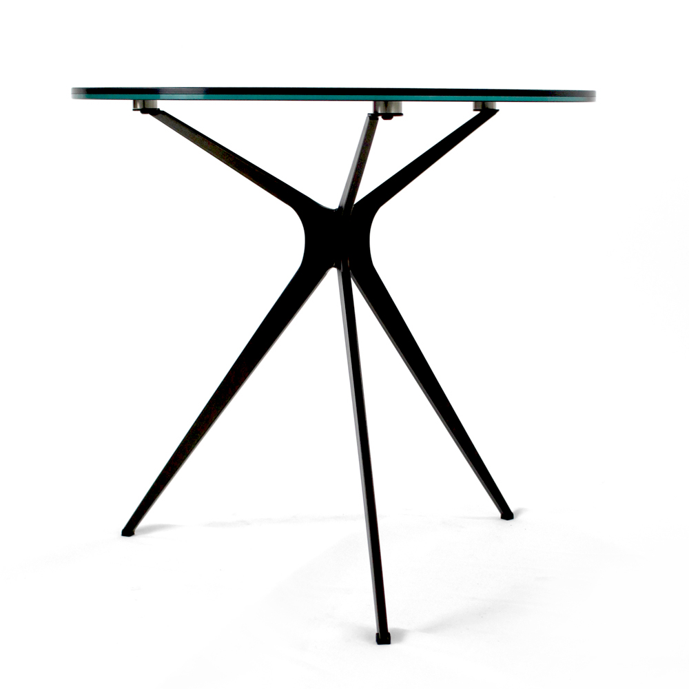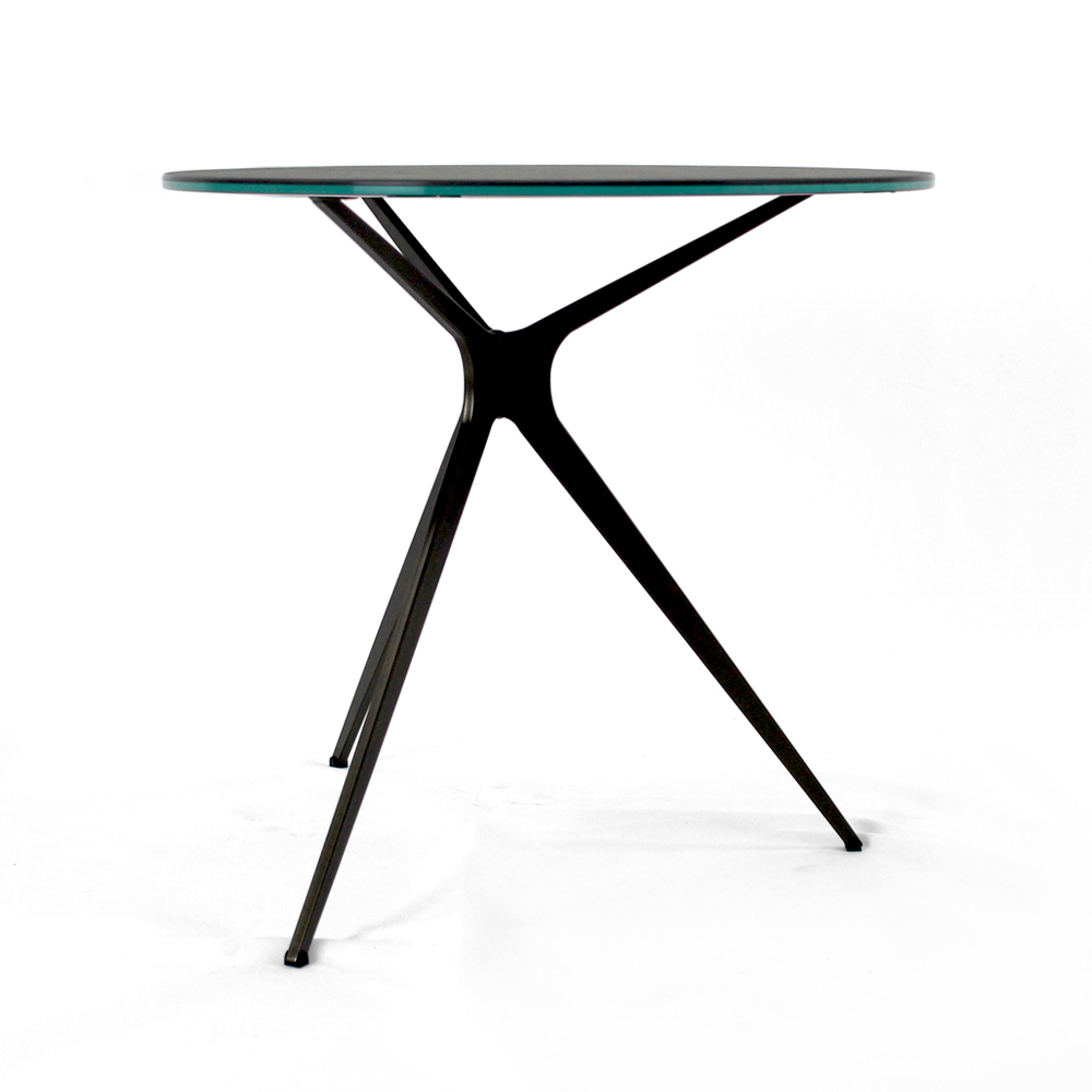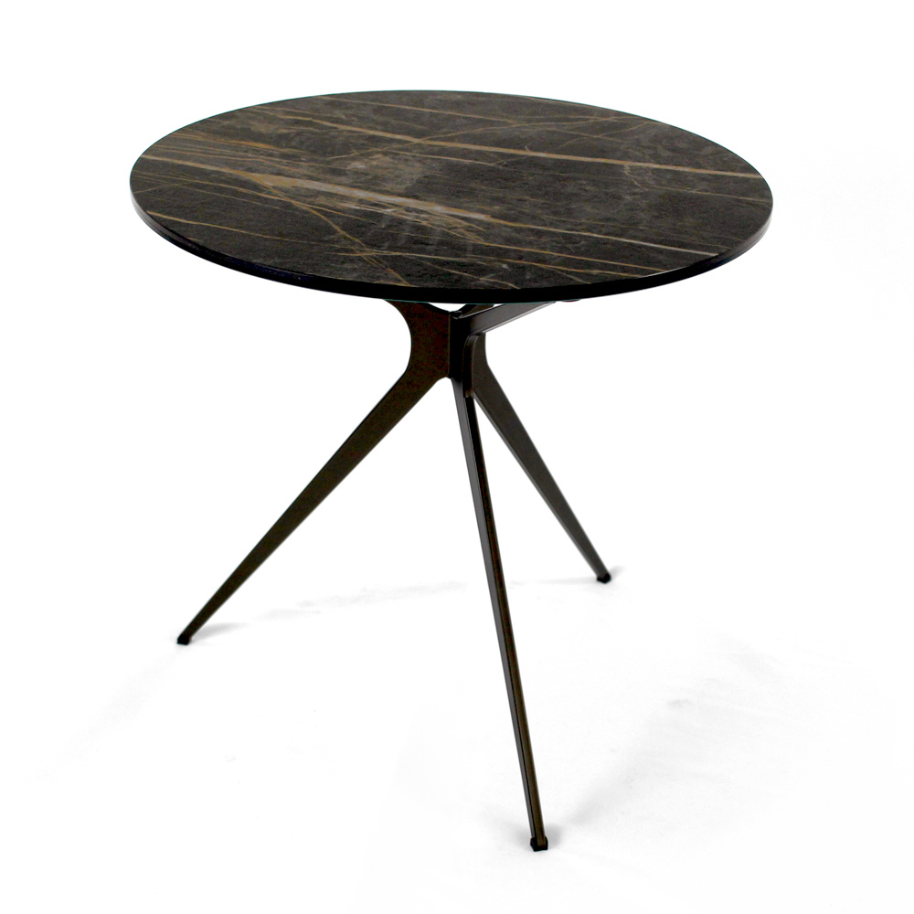 Ronde salontafel met gelakt stalen onderstel en porselein steengoed top.