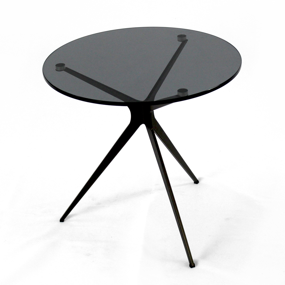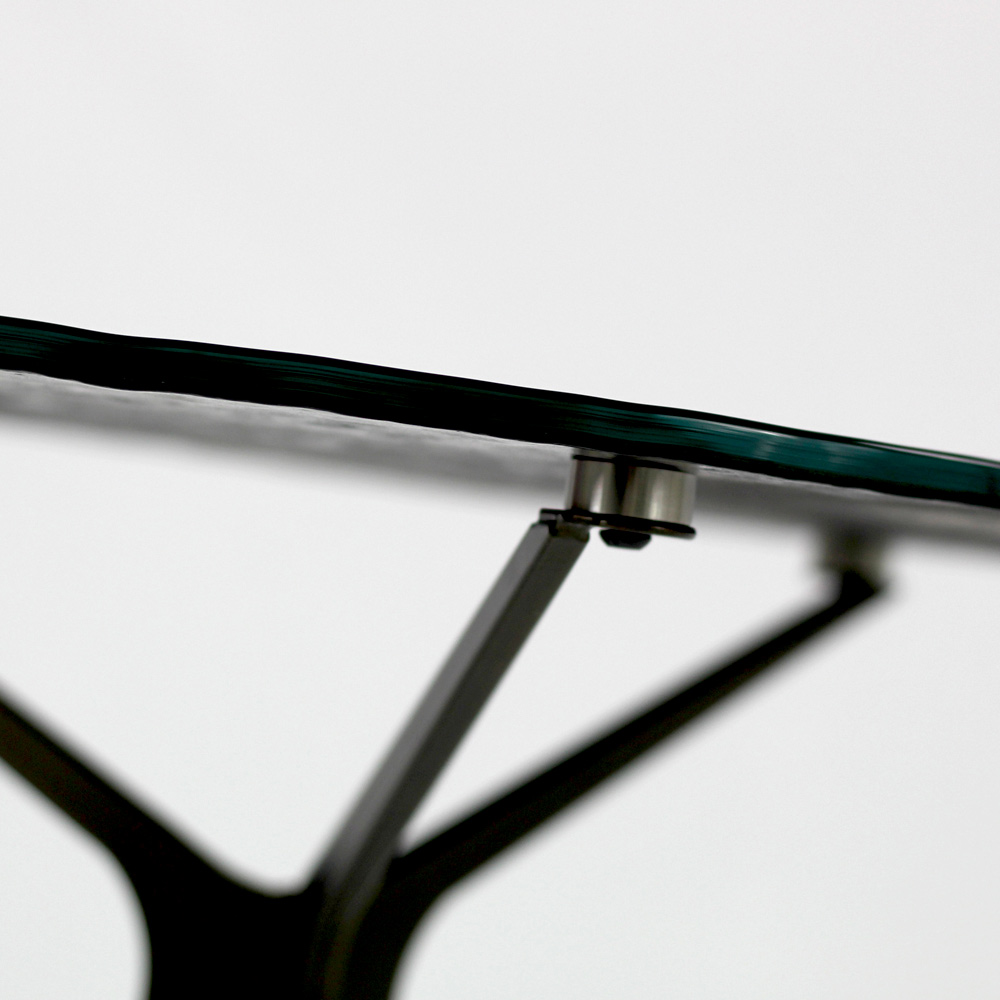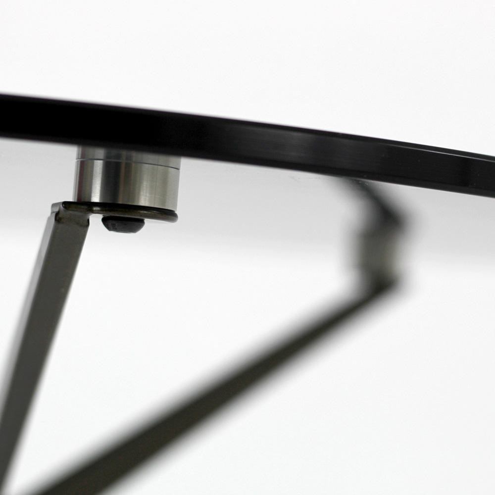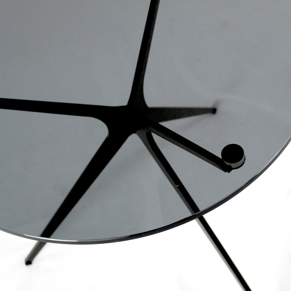 Ronde salontafel met gelakt stalen onderstel en glazen blad.