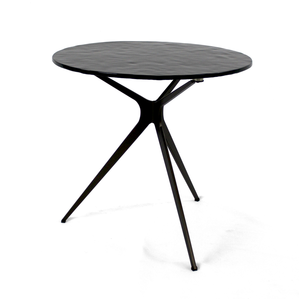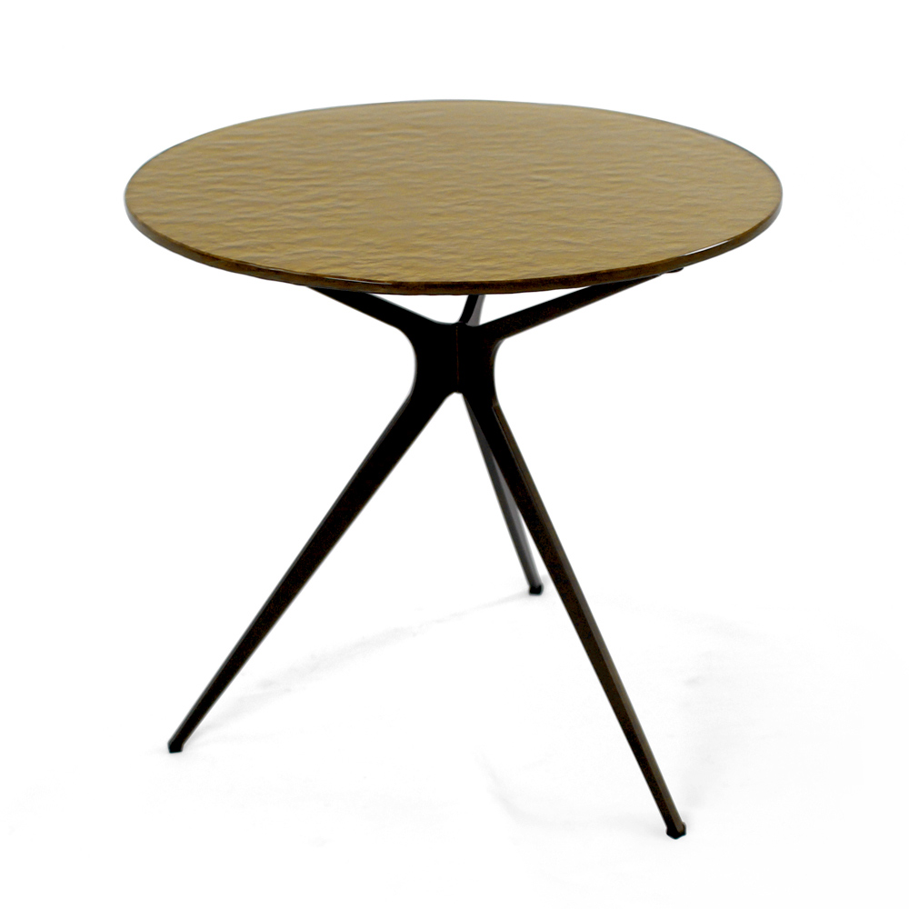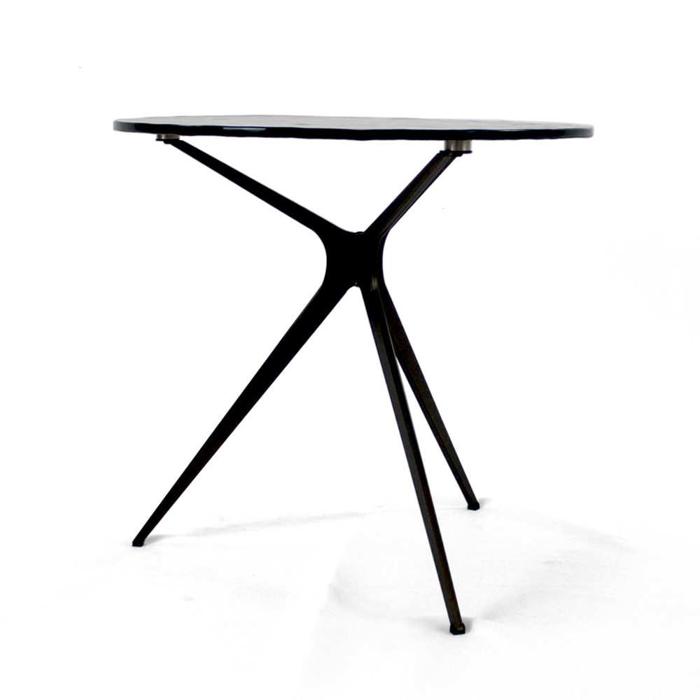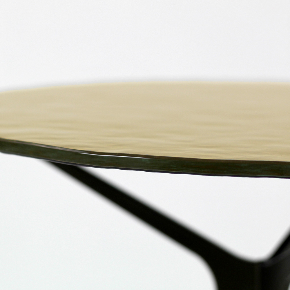Ronde salontafel met gelakt stalen onderstel en glazen blad.