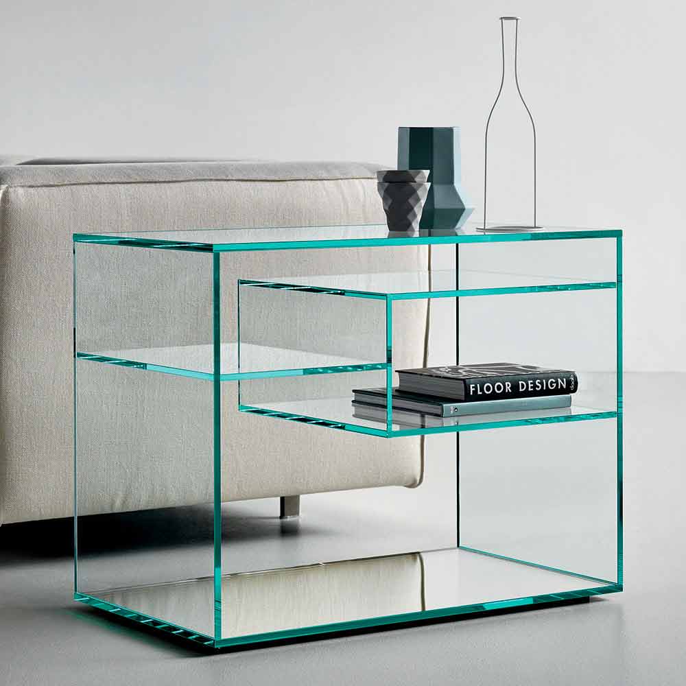 Deze salontafel of nachtkastje wordt gekenmerkt door zijn veelzijdige , elegante en minimalistische design, volledig gemaakt van extra helder glas met spiegelvoet.