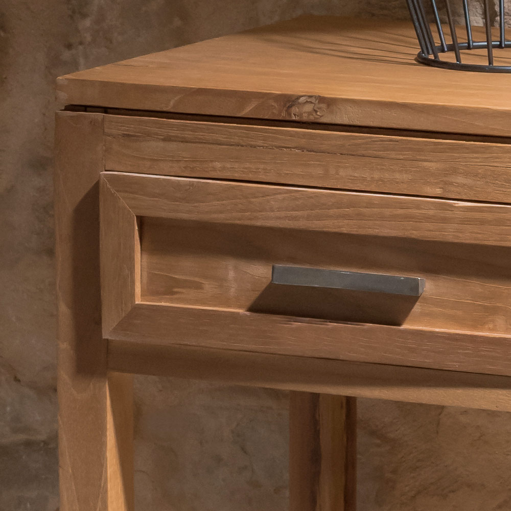 Deze massief teakhouten salontafel is een compact en veelzijdig meubelstuk, ideaal als bijzettafel, dressoir of nachtkastje. Het vakmanschap en de natuurlijke houtnerf geven dit meubelstuk een authentieke en tijdloze uitstraling, perfect voor elke kamer in huis.