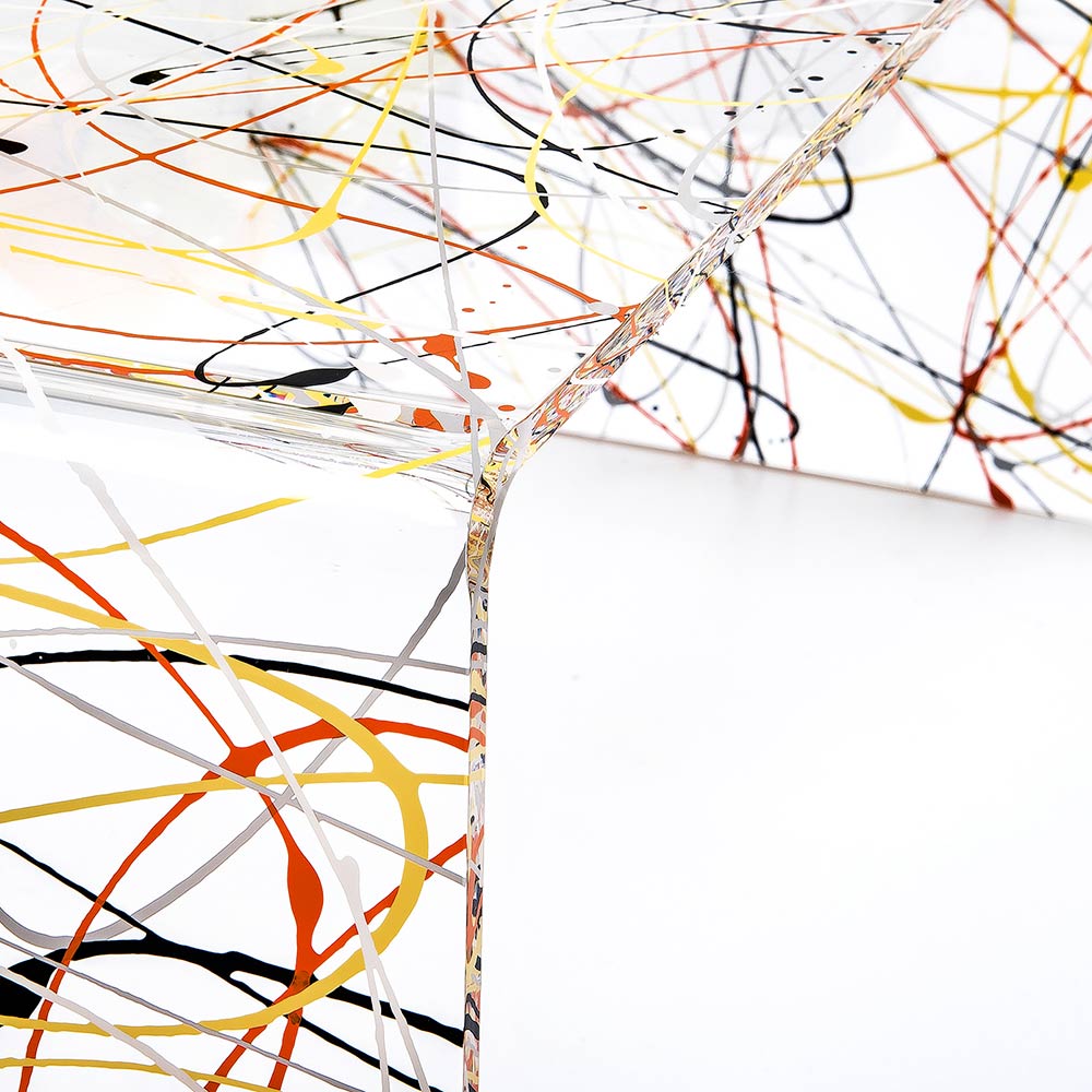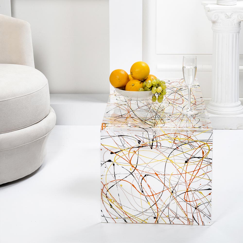 Salontafel bedacht, ontworpen en gemaakt in Italië door het gebruik van innovatieve en hoogwaardige materialen zoals transparant plexiglas met veelkleurige decoraties , wat ideaal is omdat het niet giftig, hypoallergeen, geurloos, antibacterieel en 100% recyclebaar is. Deze salontafel is ontworpen om de woonkamer of het slaapgedeelte smaakvol en functioneel in te richten en fungeert als een modern, eenvoudig en veelzijdig inrichtingselement .