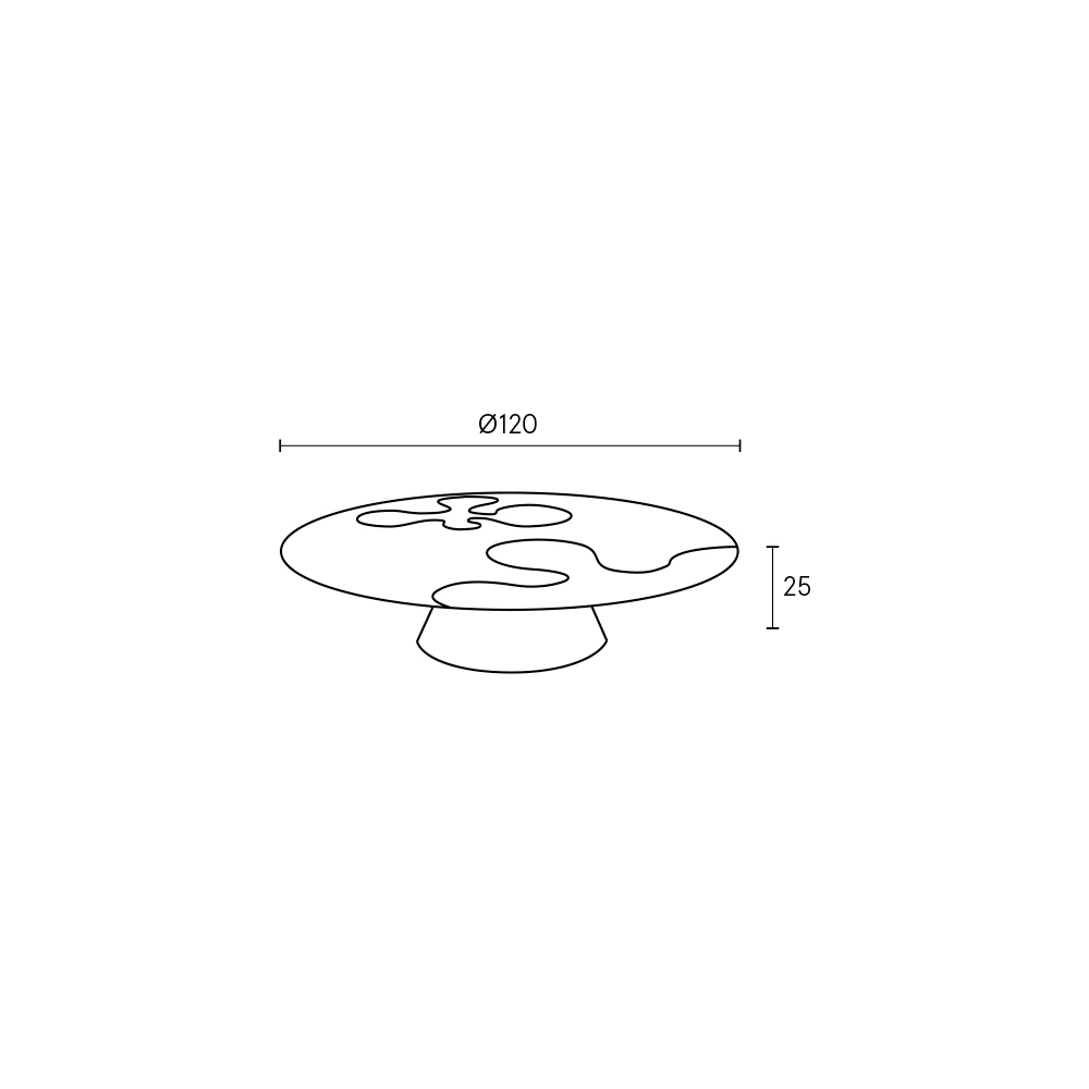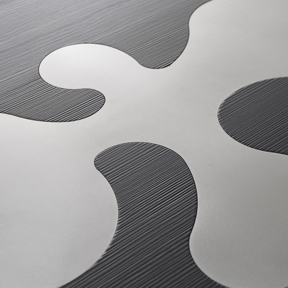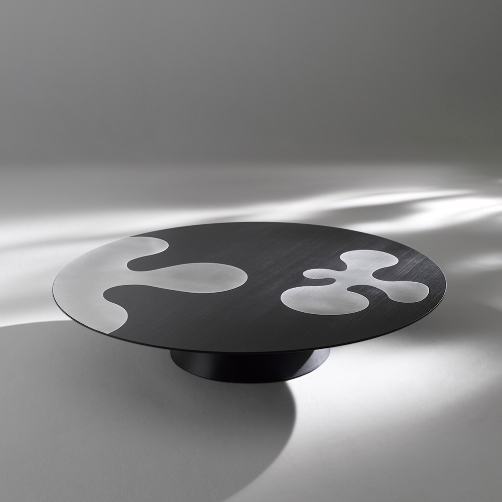 Deze ronde design salontafel valt op door zijn grafische, eigentijdse esthetiek, waar strakke vormen samenkomen met een verfijnd samenspel van contrasterende materialen. Het ronde blad vormt een werkelijk expressief oppervlak, met satijngepolijste roestvrijstalen inlays die als abstracte, dynamische motieven uit de donkere achtergrond tevoorschijn komen.