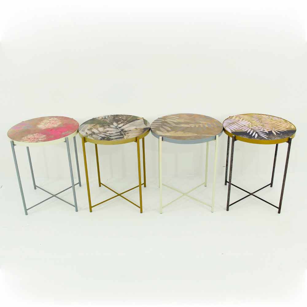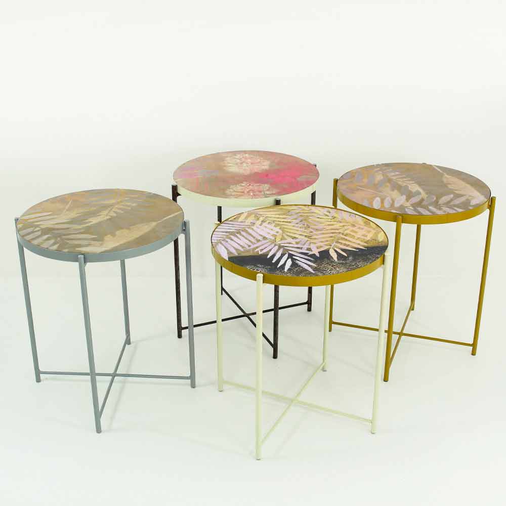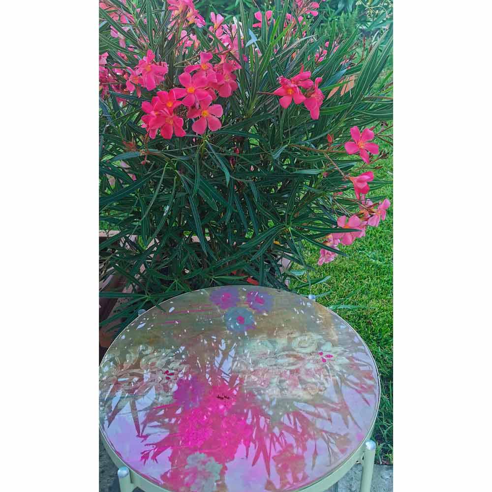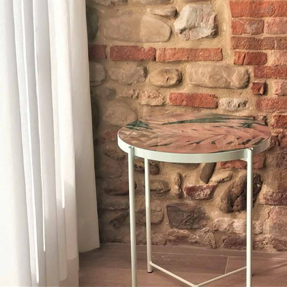Salontafel voor binnen of buiten met metalen onderstel en blad gedecoreerd en met hars bekleed Made in Italy.