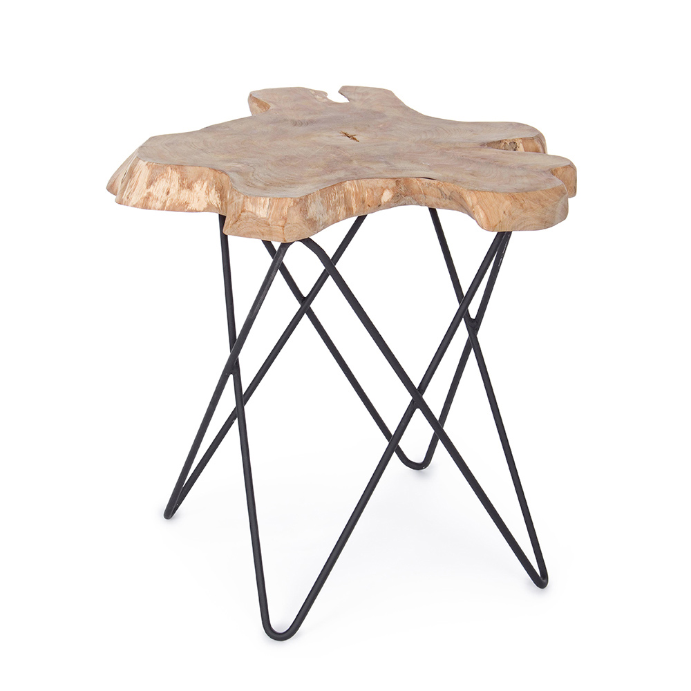Deze salontafel in de woonkamer is gemaakt met een vloer van teakroots met een natuurlijke afwerking En poten in epoxy gepoedercoat staal.