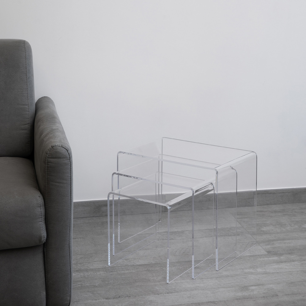 Drieluik salontafels in transparant acrylkristal, gemaakt in Italië.