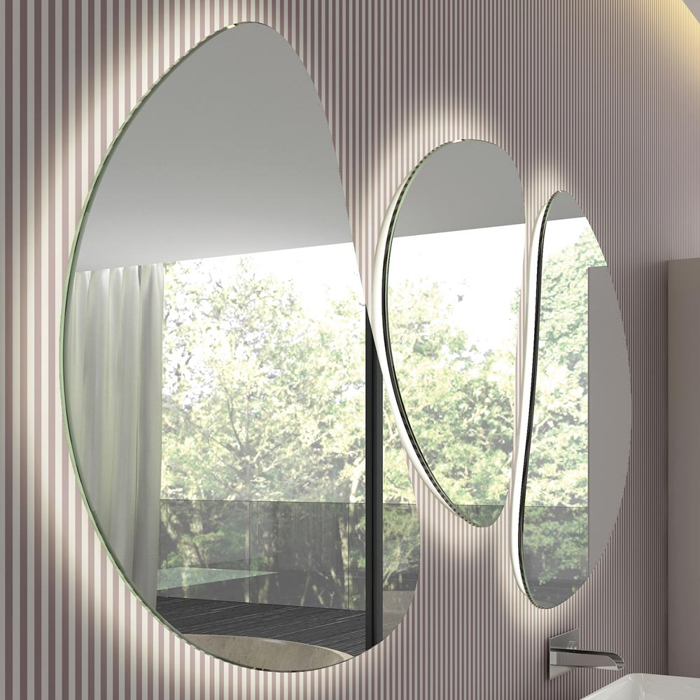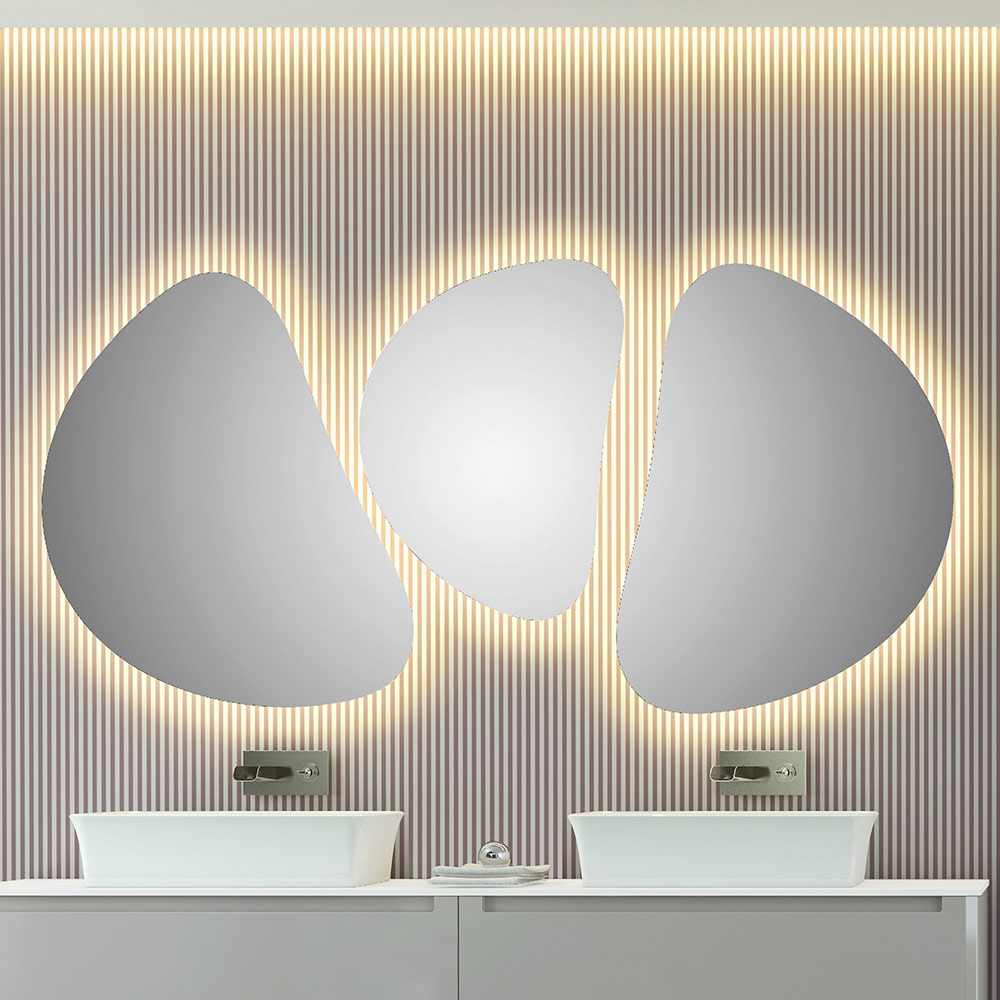 minimale en essentiële vormen, gevormd in de vorm van een boon. De 4000k LED-achtergrondverlichting verspreidt zich vanaf de randen en heeft een dubbele functie: die van sfeerverlichting of directe verlichting op de gootsteen.