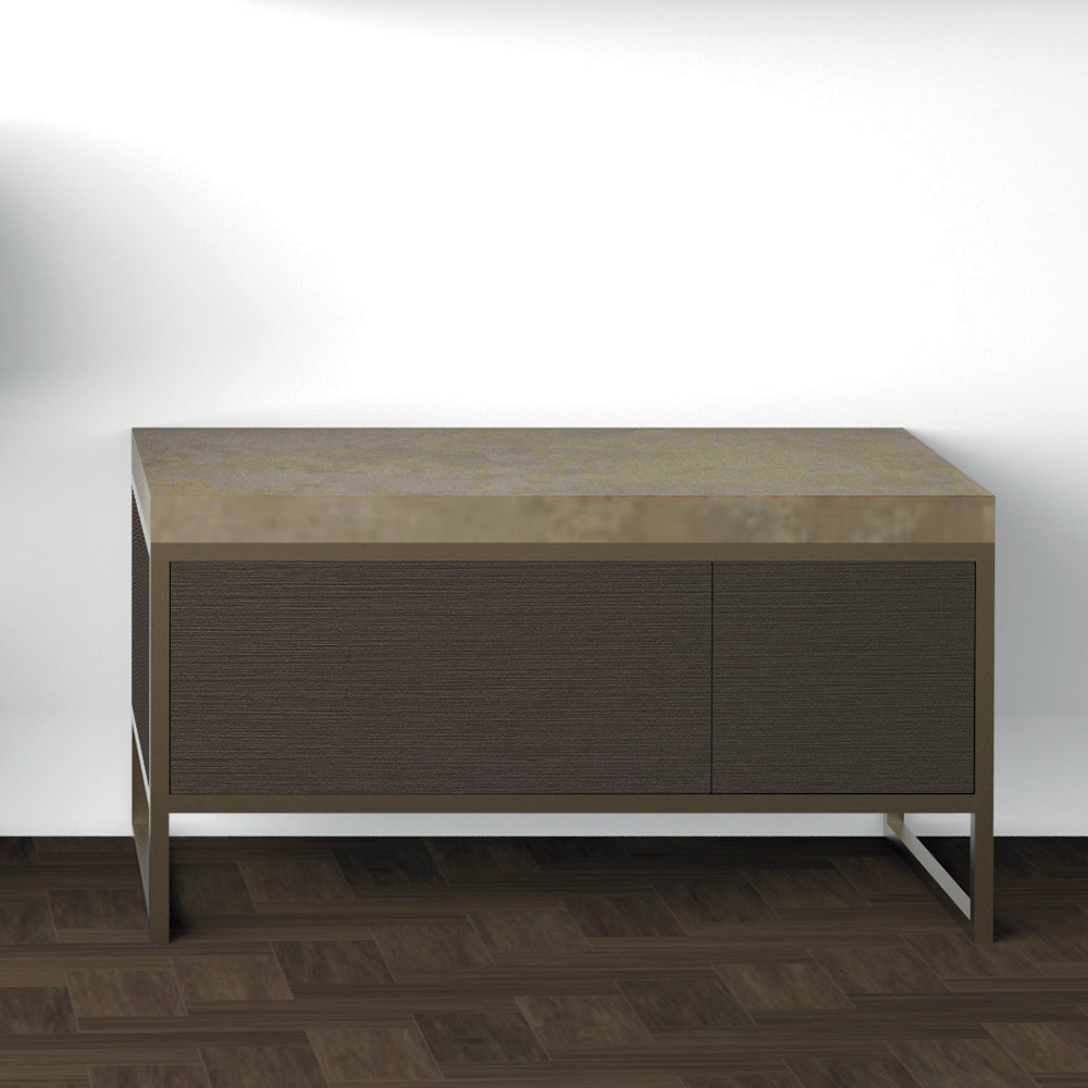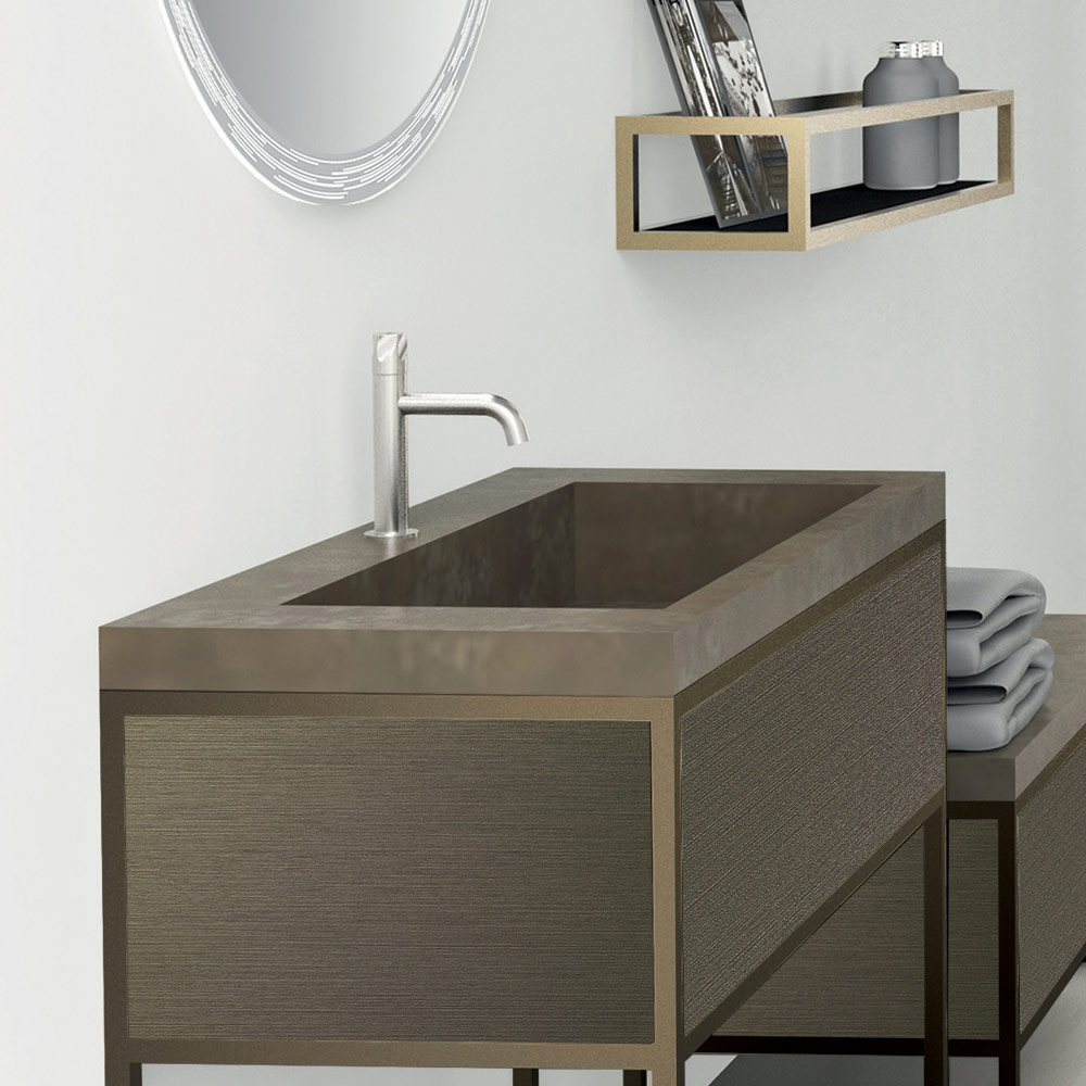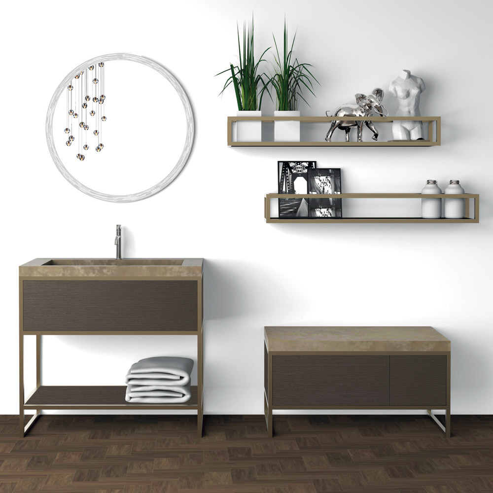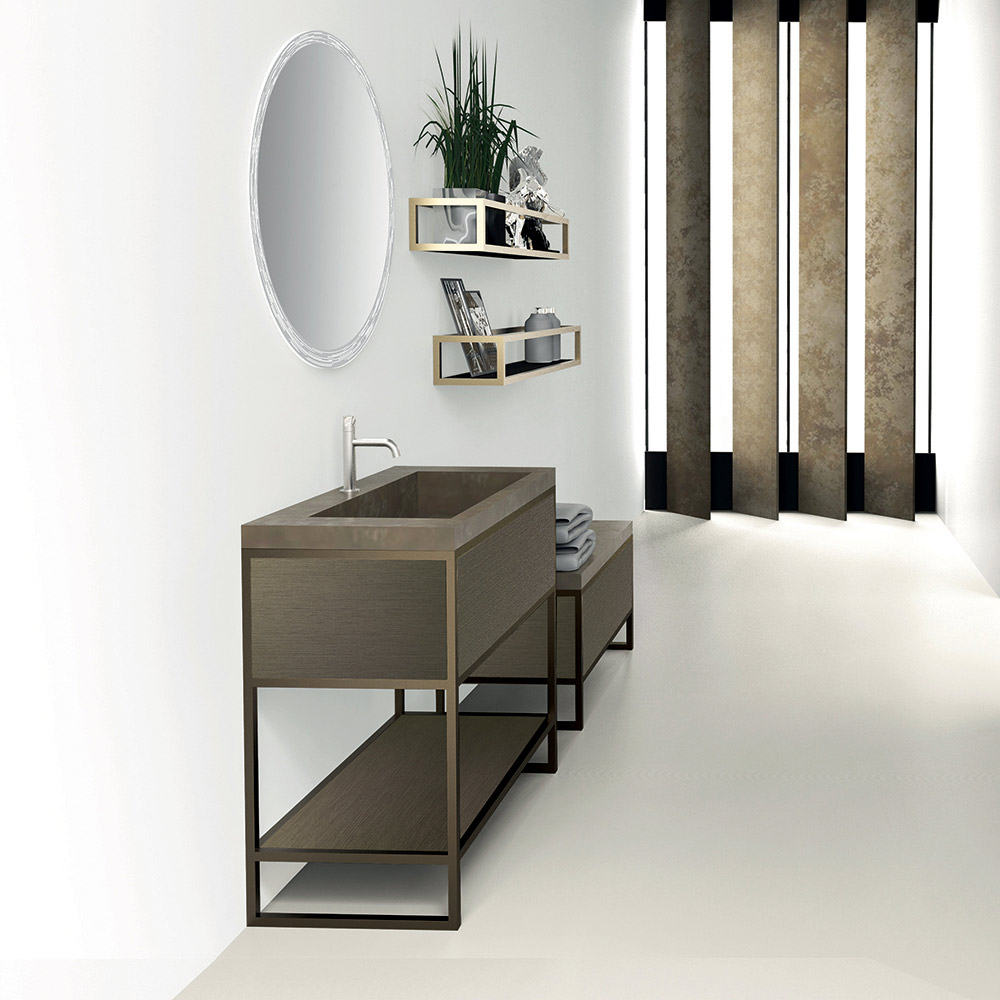 badkamermeubels wordt gekenmerkt door een structuur gemaakt met een dun metalen profiel in een antieke bronzen afwerking die de deuren omlijst in metaal brons eco-hout, waardoor een harmonieuze combinatie van volle en lege ruimtes ontstaat. De metalen afwerkingen van de deuren benadrukken de