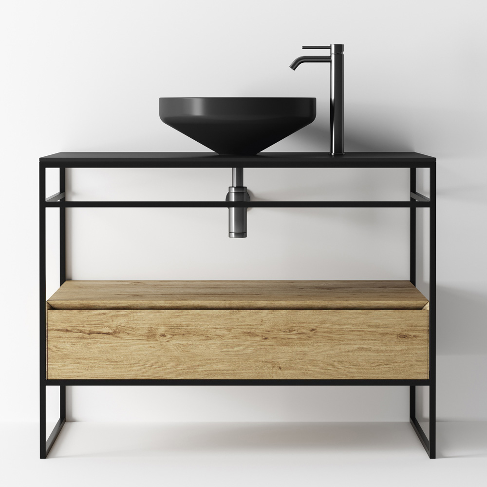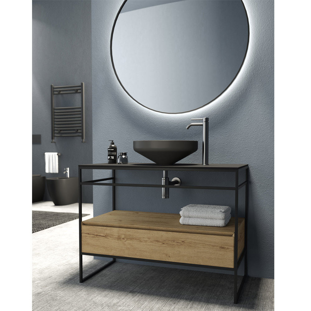 Badkamermeubelcompositie volledig gemaakt in Italië bestaande uit een keramische wastafel in matzwarte afwerking , onderstel met structuur in matzwart roestvrij staal en blad in matzwart keramiek met praktische lade in eikenhouten afwerking met 45° snede en langzaam sluitend. De compositie wordt gecompleteerd door de ronde verlichte wandspiegel met aluminium frame met mat zwarte afwerking.