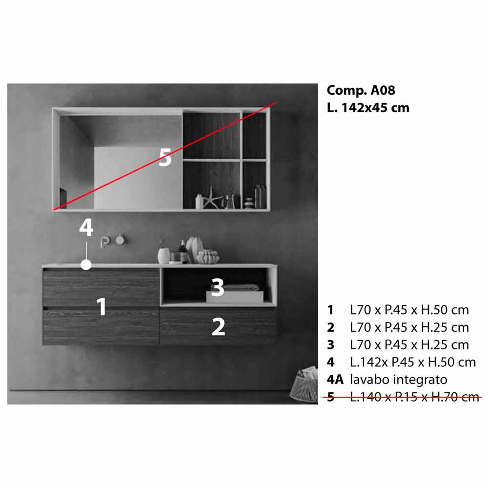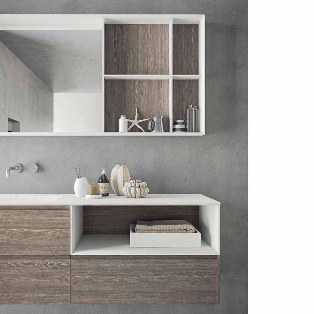 De meubelset is in tabakseiken unicolor HPL , geïntegreerde wastafel in mat wit Novcryl , open compartiment in mat witte lak en rug in tabakseiken unicolor HPL.