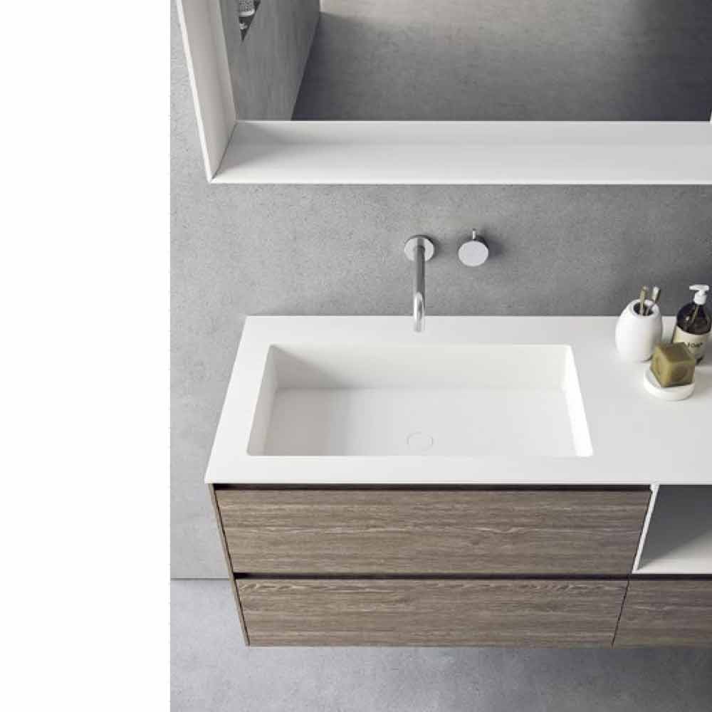 Minimale badkamersamenstelling, hangend en gebogen ontwerp met geïntegreerde wastafel, gemaakt in Italië.