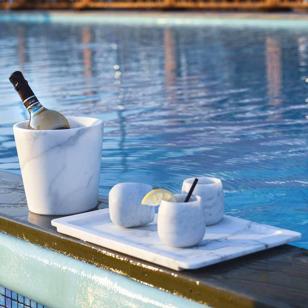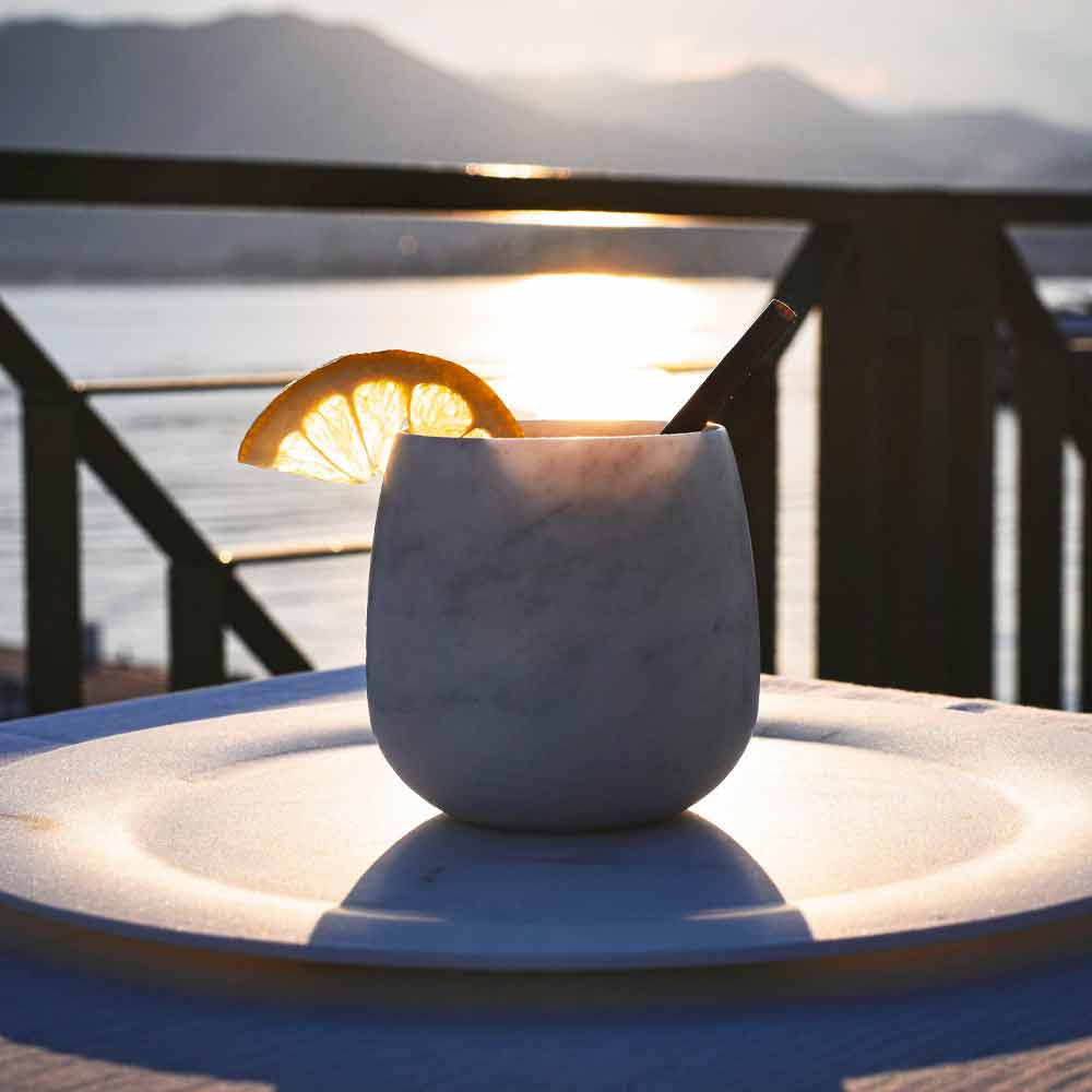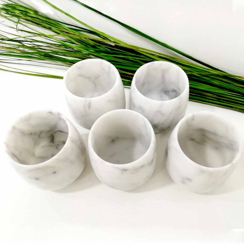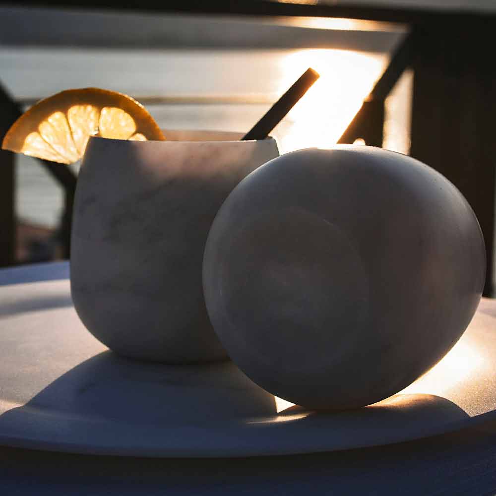 NB : vanwege de karakteristieke porositeit van marmer, wordt het niet aanbevolen om gekleurde dranken erin te gieten om de natuurlijke witte tint van het marmer zo goed mogelijk te behouden.