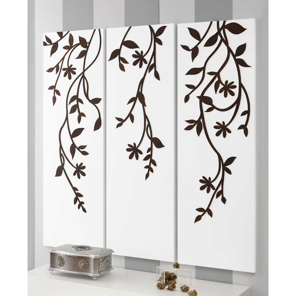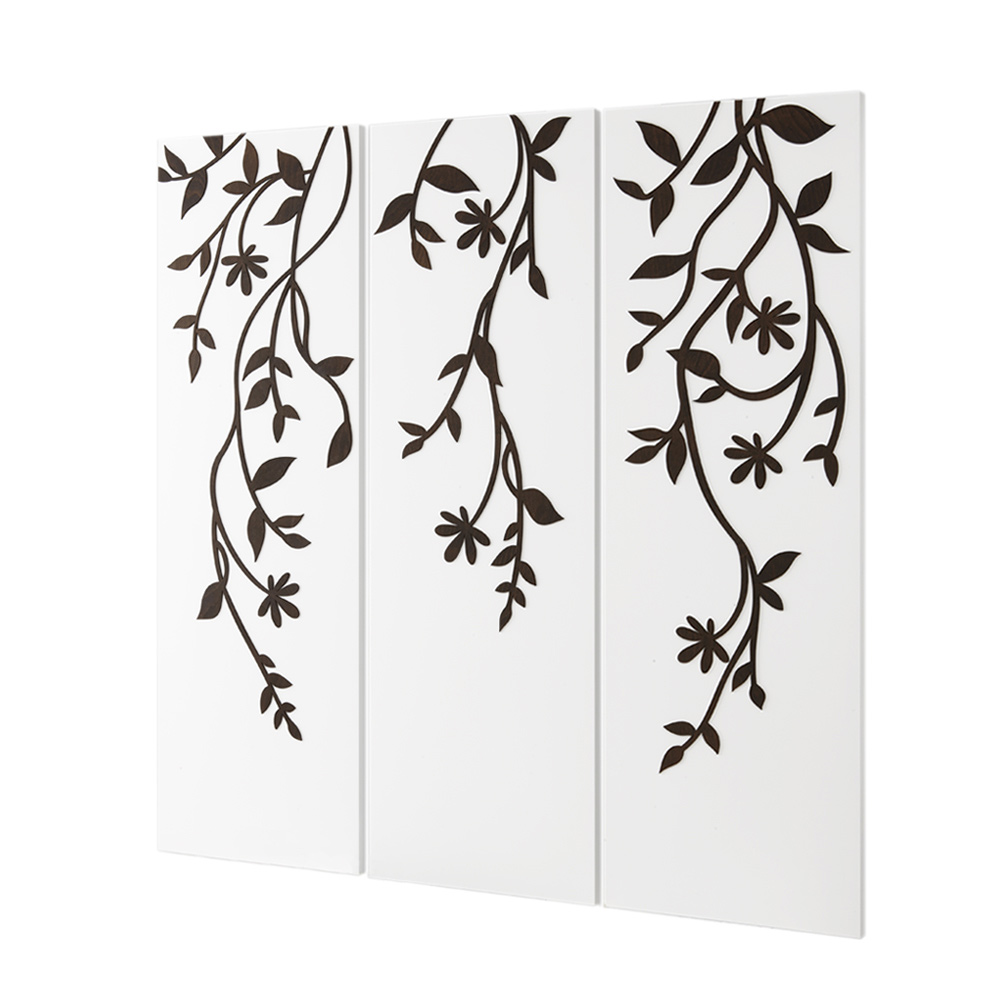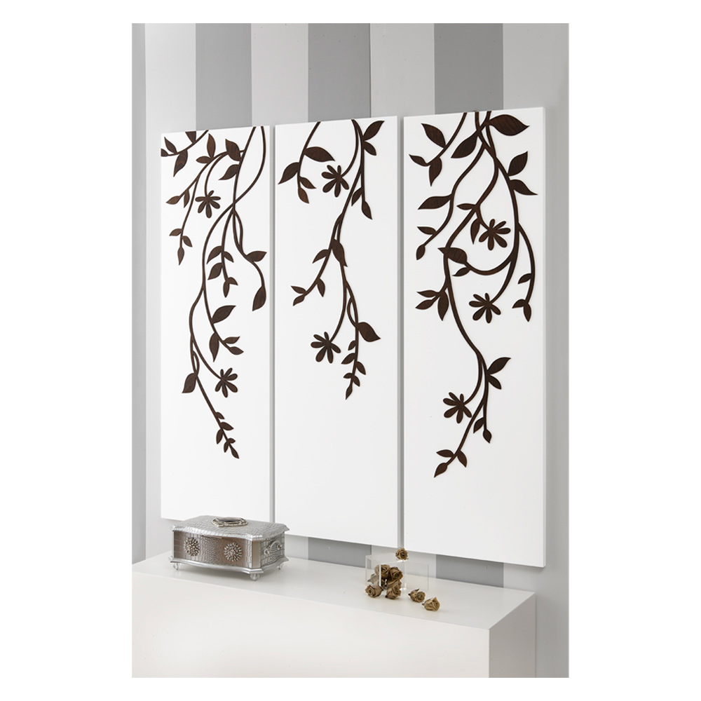 Samenstelling van 3 panelen om afzonderlijk op te hangen in mat wit gelakt hout met applicatie in wengéhout die takken voorstelt met van bovenaf vallende bladeren.