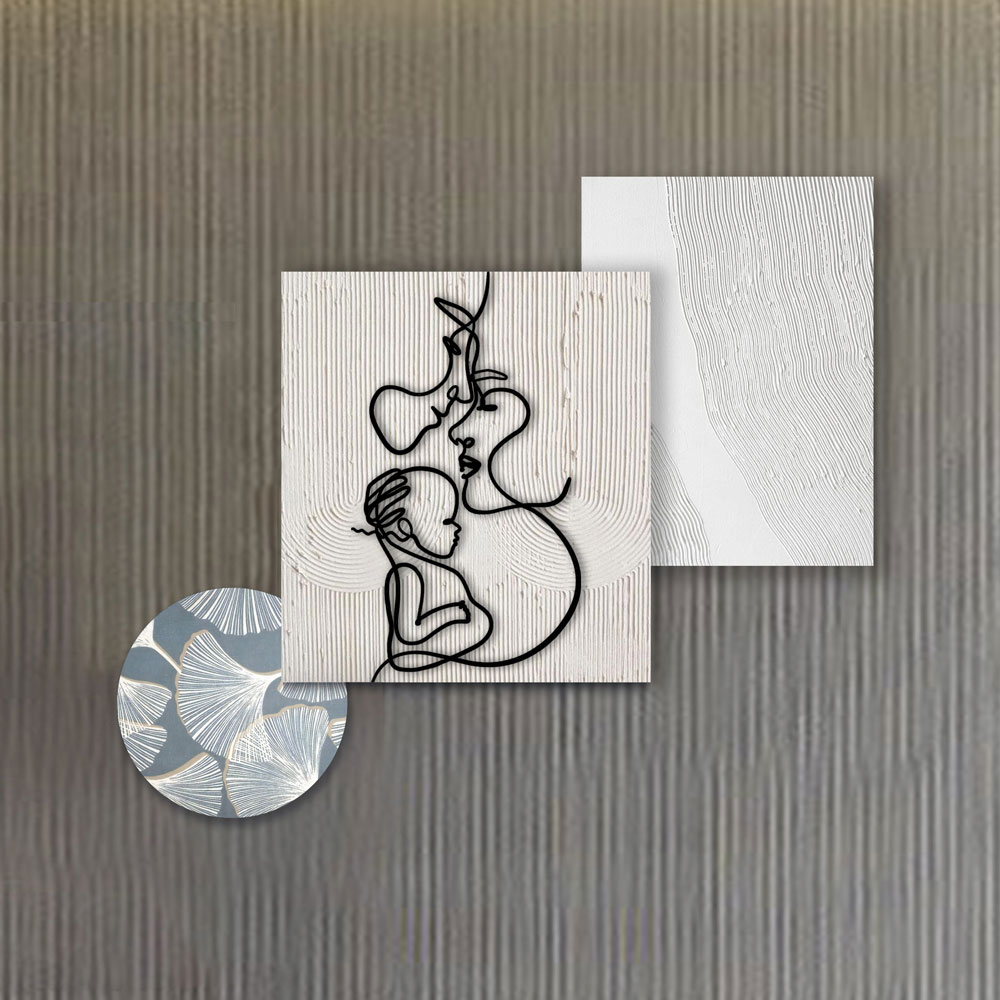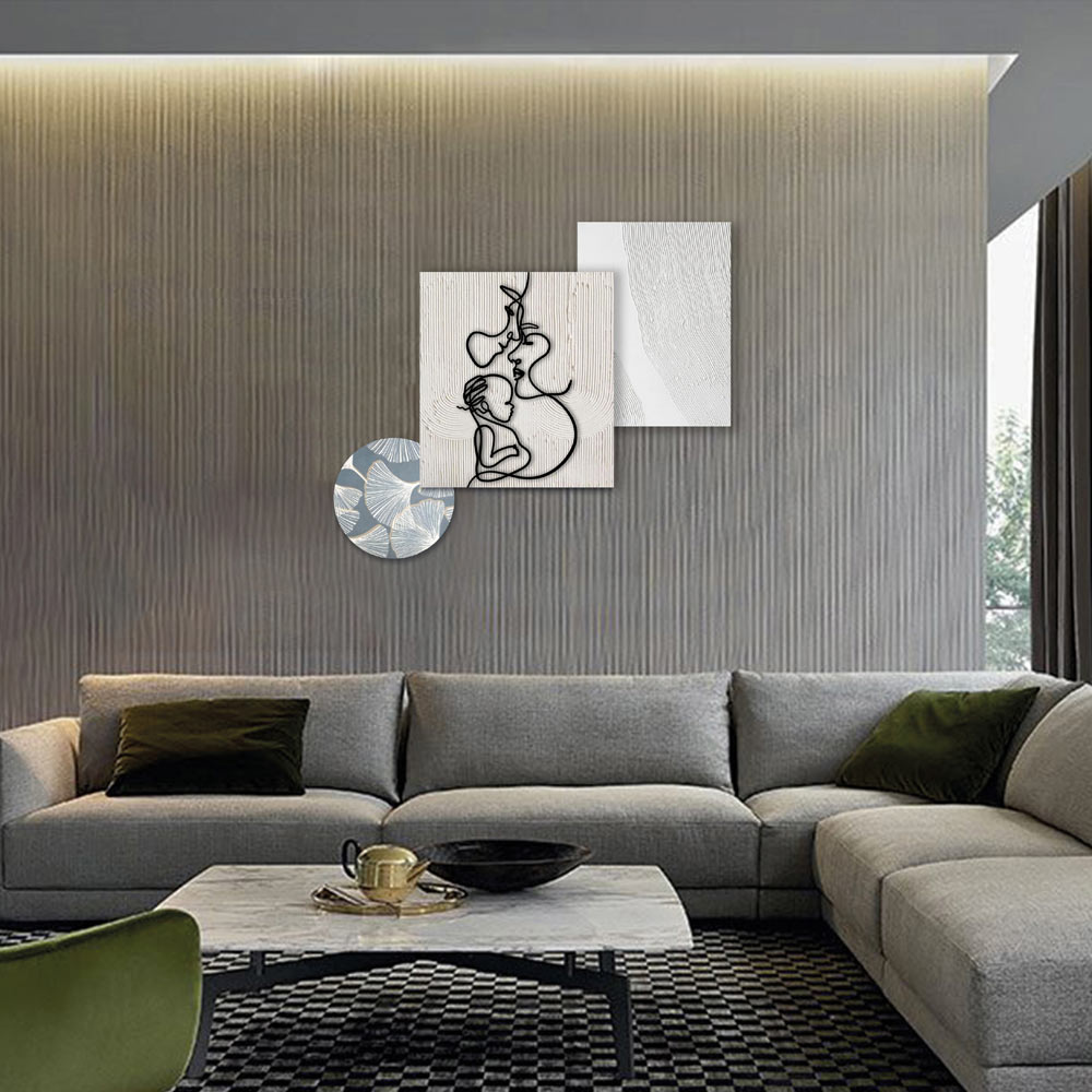 Samenstelling van drie panelen van verschillende vormen en afmetingen die laser- en printdecoraties combineren. Samengesteld uit drie panelen in bedrukt hout : een ronde met witte bloemblaadjes, een rechthoekige die de liefde van een familie stileert en een rechthoekige met lijnen in hoog reliëf.