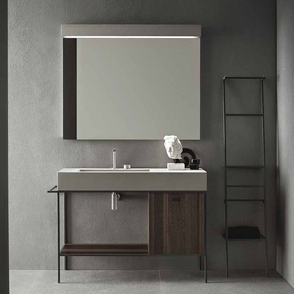 Deze samenstelling is in warmtebehandeld eiken , wastafel in lichtgrijze cementhars; schraag en ladder voor objecten in mat donkergrijze lak.