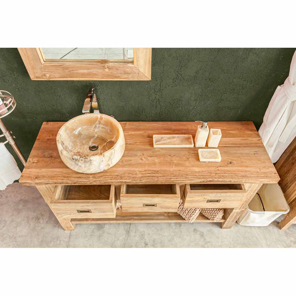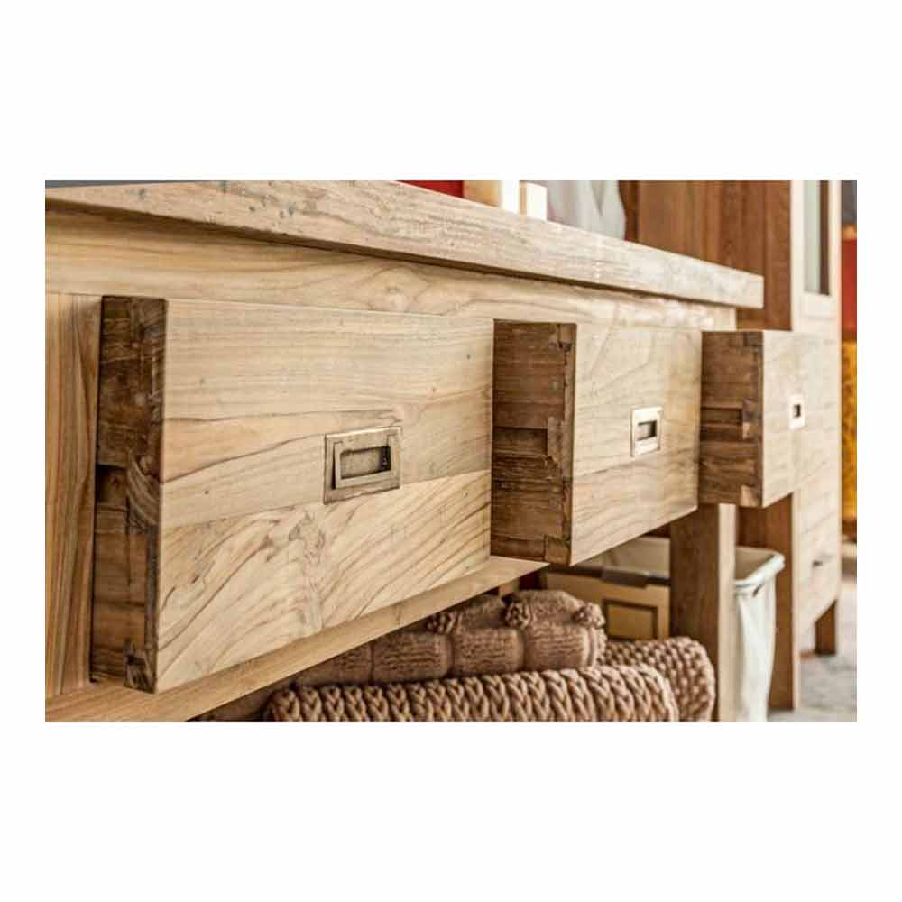 Teak met strakke en gestroomlijnde vormen, staal en schroeven in symbiose met de warmte van hout. Teak dat kostbaar en verfijnd wordt door te voldoen aan de hars of zeldzaam en uniek wanneer oud en ingelegd in de badkamer verschijnt, biedt nieuwe oplossingen en nieuwe stimuli om de badkamerruimte te transformeren in een exclusieve en besloten plek die lichaam en geest kan regenereren.