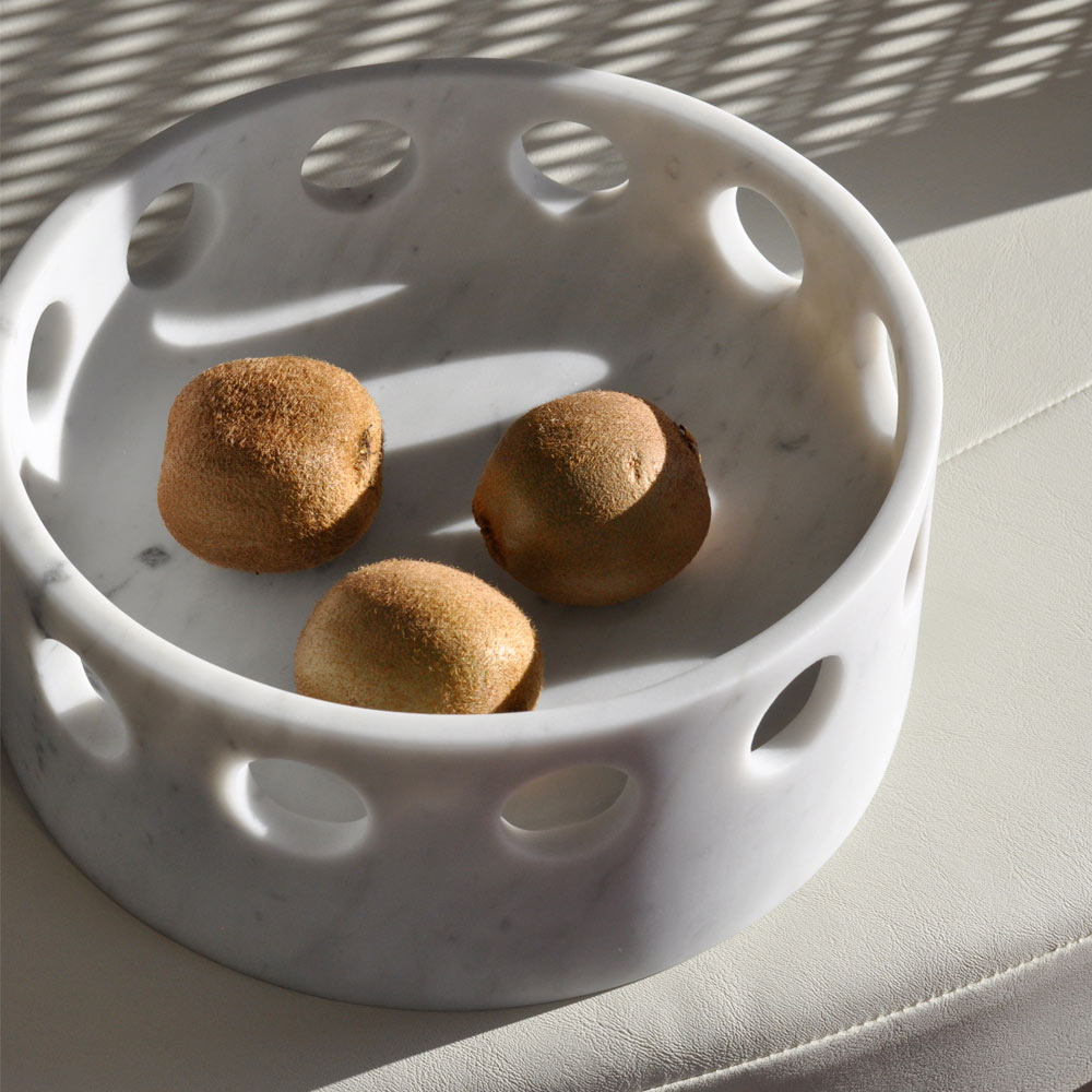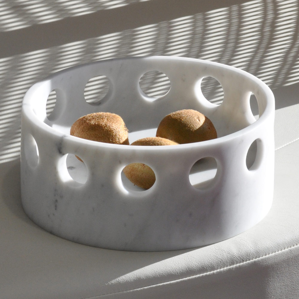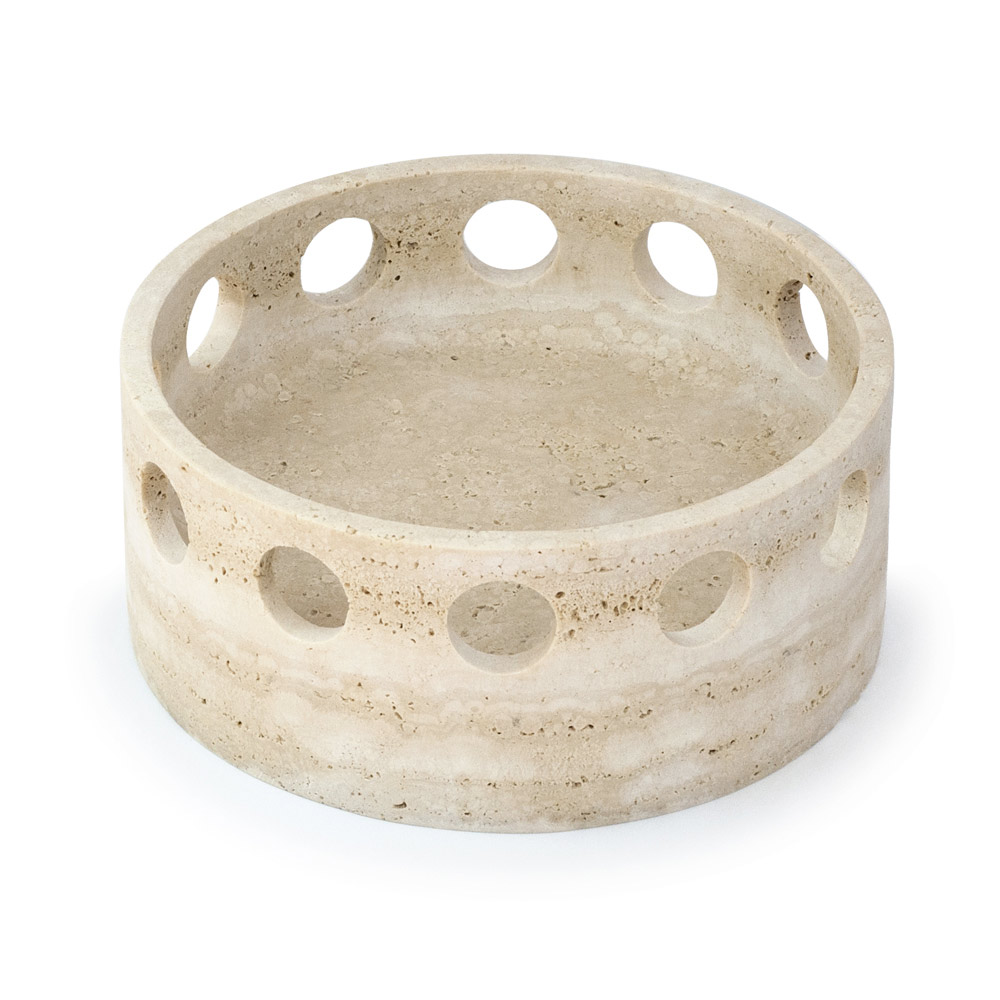 Breng een vleugje verfijnde elegantie in uw huis met dit marmeren middelpunt/zakblad. Het ronde ontwerp en de symmetrische perforaties maken het tot een uniek en stijlvol stuk, perfect om elke tafel of console eenvoudig te verrijken. De kwaliteit van marmer, een duurzaam en nobel materiaal, viert het beste van Italiaans vakmanschap .